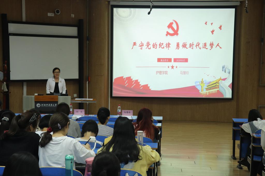 讲座中,马慧玲副书记以《严守党的纪律,勇做时代逐梦人》为主题,从党的纪律工作的发展历程、重要意义和重要事迹等方面,为同学们营造了崇廉尚俭的文化氛围。同时,马慧玲副书记结合2020级新生签订“文明用餐,节约粮食”承诺书一事,要求同学们要养成勤俭节约的好习惯。最后,马慧玲副书记对同学们提出了三点要求,一要树立廉洁意识、底线思维,扣好人生的第一粒扣子;二要树立正确的世界观、人生观、价值观,诚信做人;三要树立勇于担当的精神,做时代逐梦人。