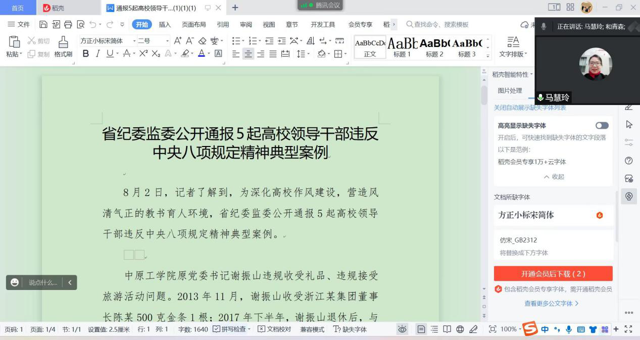 会上,学工办副主任谭亚男、学生党总支书记和青森领学了《省纪委监委公开通报5起高校领导干部违反中央八项规定精神典型案例》,中原工学院原党委书记谢振山违规收受礼品、违规接受旅游活动问题等五起案例严重违反了中央八项规定精神,纪律规矩意识淡薄,十九大之后,顶风违纪,仍然不收敛不收手。该典型案例的学习,警示大家要强化规矩意识,切实增强落实中央八项规定精神的思想自觉、政治自觉和行动自觉,在工作和生活中要遵纪守法,不存侥幸心理。