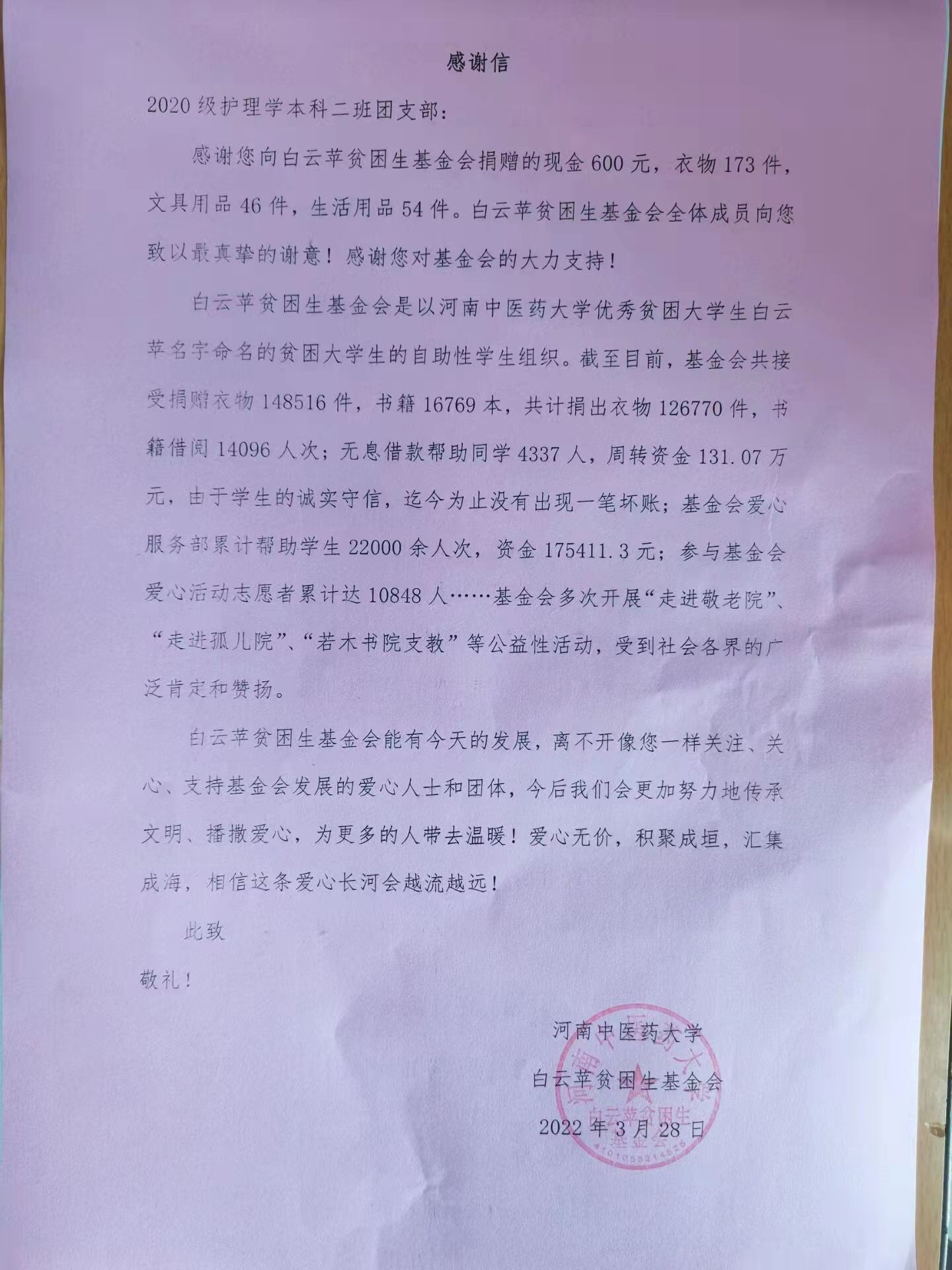 (文/图 俞佳)为激励广大青年团员传承雷锋精神,培养班级学生关心他人、服务社会的优良品质,2022年雷锋月期间,万象城awcsport官网2020级护理学本科二班团支部开展“济困助学”特色品牌活动,师生共同参与捐款捐物奉献爱心。