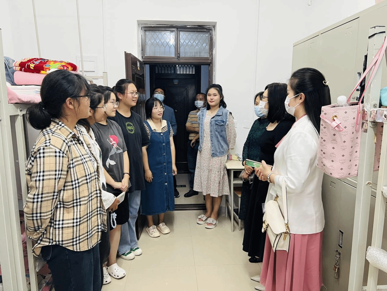 本网讯(文图/高山)为深入了解2022级新生入学状况,强化学生安全意识,2022年9月21日,万象城awcsport官网院长曹姗、党委副书记马慧玲、副院长刘玲霞及学院辅导员进入新生宿舍走访,了解新生返校情况及生活状态、强调要重视宿舍安全及宿舍卫生,与新生进行亲切交流。