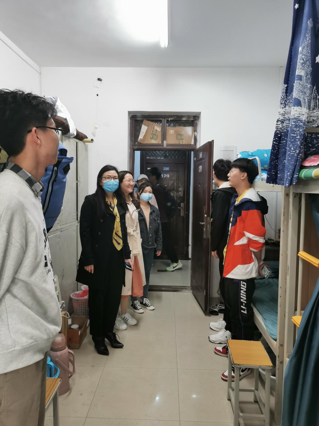 走访过程中,马慧玲和辅导员老师们对同学们宿舍卫生、存在的安全隐患等方面进行了严格排查,叮嘱同学们在忙碌的学习过程中,整洁卫生的宿舍环境尤为重要,尤其是疫情常态化情况下,务必要加强宿舍的内务整理,多开窗,勤通风。同时对一些存在问题的宿舍现场提出了建议并要求尽快整改,提醒同学们要注意用电安全,要强化安全意识,并对有特色的宿舍进行了表扬和赞赏,耐心亲切地与同学们就如何打造特色宿舍文化进行了交流和沟通。