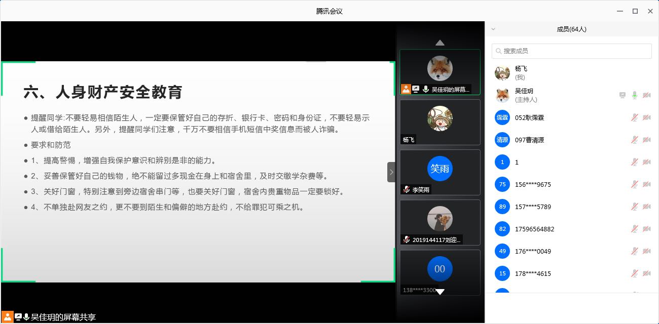万象城awcsport官网全体学工办人员以及全院学生参加了班会,在暑假安全教育线上网络班会中辅导员老师向大家传达了学校关于做好假期安全教育工作的有关要求,讲授基本的安全防范知识和技能;接着中外班的生活委员通过安全教育PPT为全院学生讲述了暑期安全的重要性,其中包括增强防火、防盗、防骗意识,避免发生煤气中毒、食物中毒、火灾、交通、旅游等安全事故,防溺水、中暑、雷电、防诈骗、传销、邪教等等,通过一个个生动的案例希望广大同学引起对安全问题的重视,增强安全防范意识,提高自我保护和辨别是非的能力,保证自身安全,杜绝安全事故的发生。