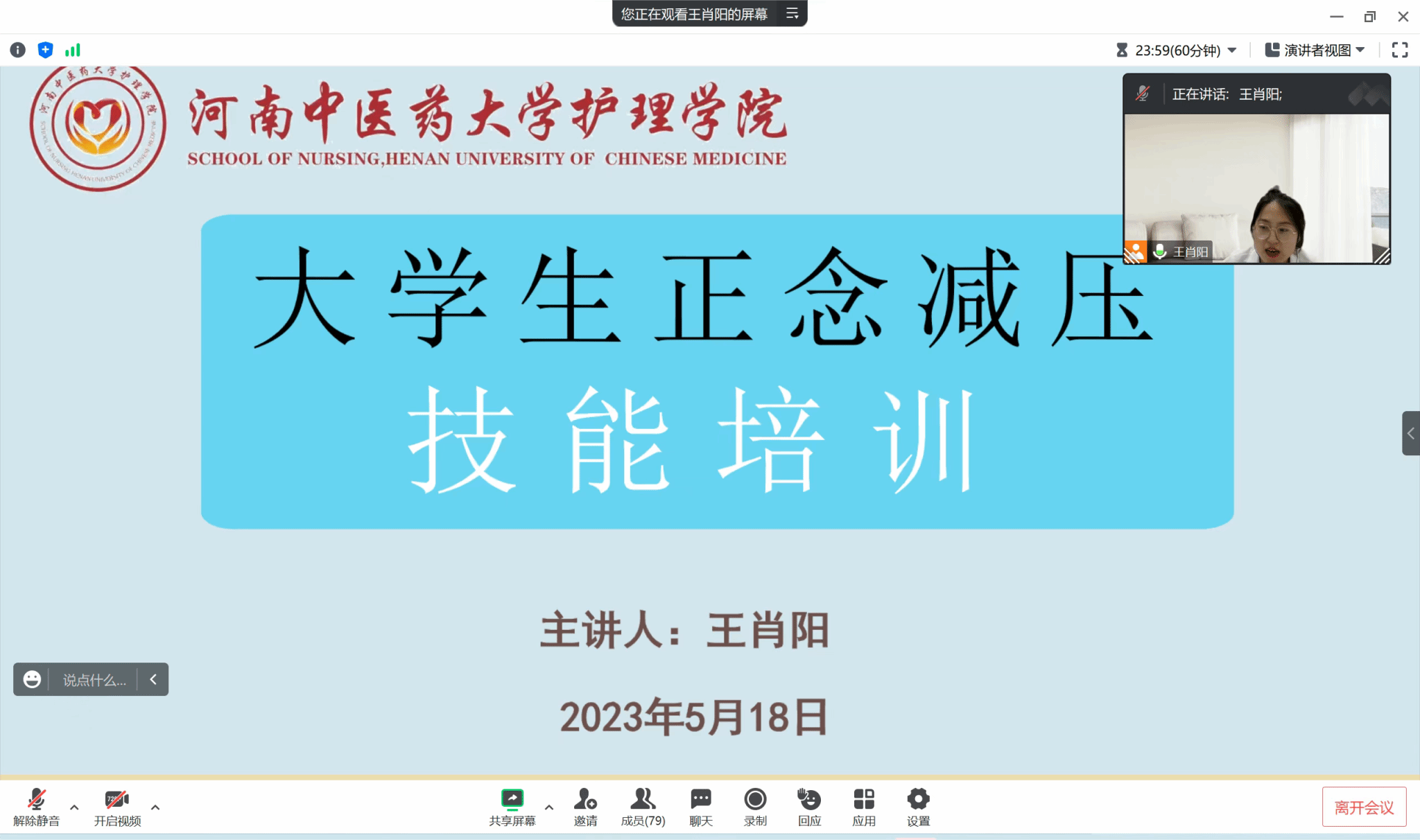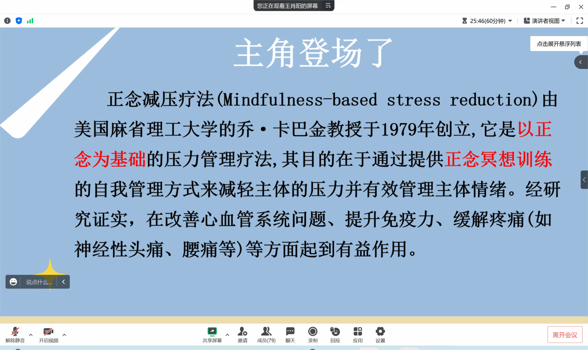 培训会上,王肖阳老师首先介绍了正念减压疗法的概念,希望同学们通过本次会议可以掌握一个减压方法,并带领班级学生灵活运用起来去克服学习生活中的压力;接着介绍了正念解压疗法的主要方法,如静坐冥想、全身扫描、正念式行走等几个非常实用的方法,为帮助同学们更好的理解并体会正念的状态,培训现场通过播放相关视频带领大家进入“冥想星球”;最后为同学们解答了生活和学习中的疑惑。此次培训注重因材施教,通过现实生活举例,寓教于乐,调动了同学们的积极性。