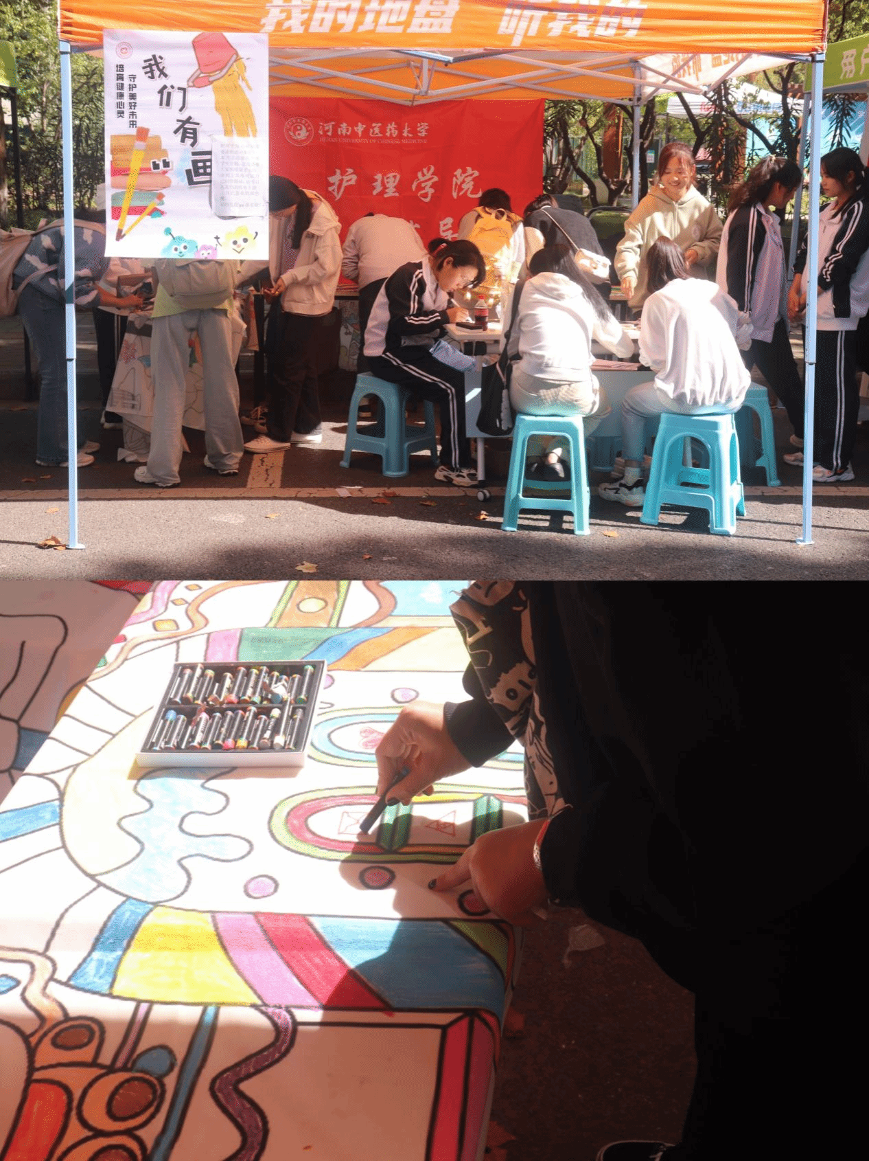 本次活动面向全体师生。活动分为两种形式,一是同学们运用现场提供的涂鸦工具进行画布涂色,完成“千人同绘”,添色校园。二是同学们可以随意发挥想象,利用现场的白卡纸和牛皮纸进行涂鸦创作,让同学们用视觉语言来表达内心的思想、情感和观点,充分激发同学们的想象力和创造力,鼓励其以生动、形象、直观的方式表达自我,进而接纳自我。同学们被现场和谐欢快的氛围所吸引,参与度极高,校领导与众多老师也驻足观看并参与体验,众师生在愉快的创作过程中改善了心理状态,释放了压力。
