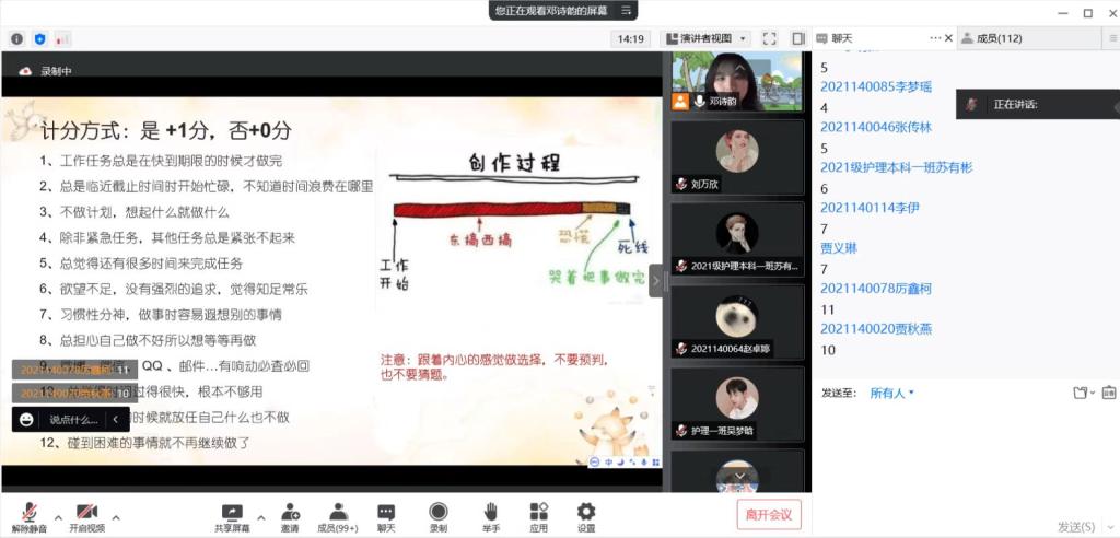 此次心理主题班会依据心理中心的要求以比赛的方式进行,各班心委需联合其他人以团队的形式制定策划书并用视频记录班会内容的全过程,心委开动脑筋积极开展,例如2019级护理本科二班选择了“内卷”的主题,通过和同学们一起探讨并分析“内卷是什么?”、“学习生活中存在哪些内卷行为?”、“同学们对内卷行为的看法?”及“在内卷背景下我们应该采取怎样做?”等问题,帮助同学们尤其是考研的同学缓解在学习中的压力;而2021级护理本科一班选择了“拖延症”这个主题,帮助同学们正确认识和管理“拖延”,更好的安排自己的时间。同时其他班级心委也选择了大学生生活中经常遇见的问题为主题,和同学们进行了分析和探讨,帮助同学们更好的解决心中的烦恼。