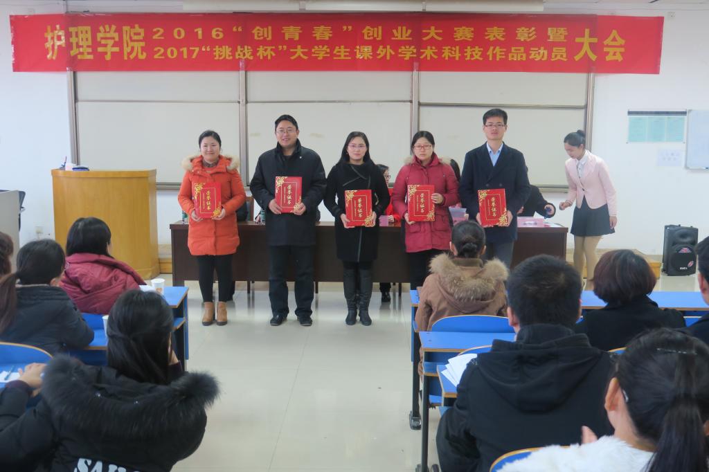杨英豪院长宣读了《关于表彰万象城awcsport官网“创青春”大学生创业大赛优秀指导老师和优秀作品的决定》文件。会上,对赵倩倩、张琼、张文举等5优秀指导老师代表和郭辉等6名获奖学生代表上台颁奖。秦元梅副院长宣读了《万象城awcsport官网2017年“挑战杯”大学生课外学术科技作品竞赛活动通知》,对万象城awcsport官网2017年“挑战杯”大学生课外学术科技作品竞赛进行了具体安排。