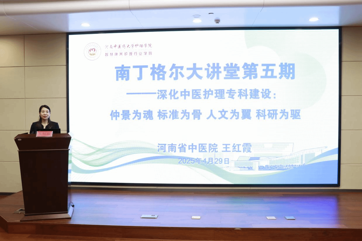 王红霞主任以河南省中医院中医护理的发展实践为切入点,围绕“医院及护理团队建设、仲景护理学术思想的传承与创新、中医护理标准化研究、中医人文护理实践”四大主题展开深入讲解。她强调,护理学子应以笃学精神夯实理论基础,以创新思维推动临床实践,将中医护理技术与现代医学相结合,实现传统智慧的当代价值。通过生动的案例分享和前沿研究成果展示,王红霞为师生呈现了一场兼具学术深度与实践启发的精彩讲座。