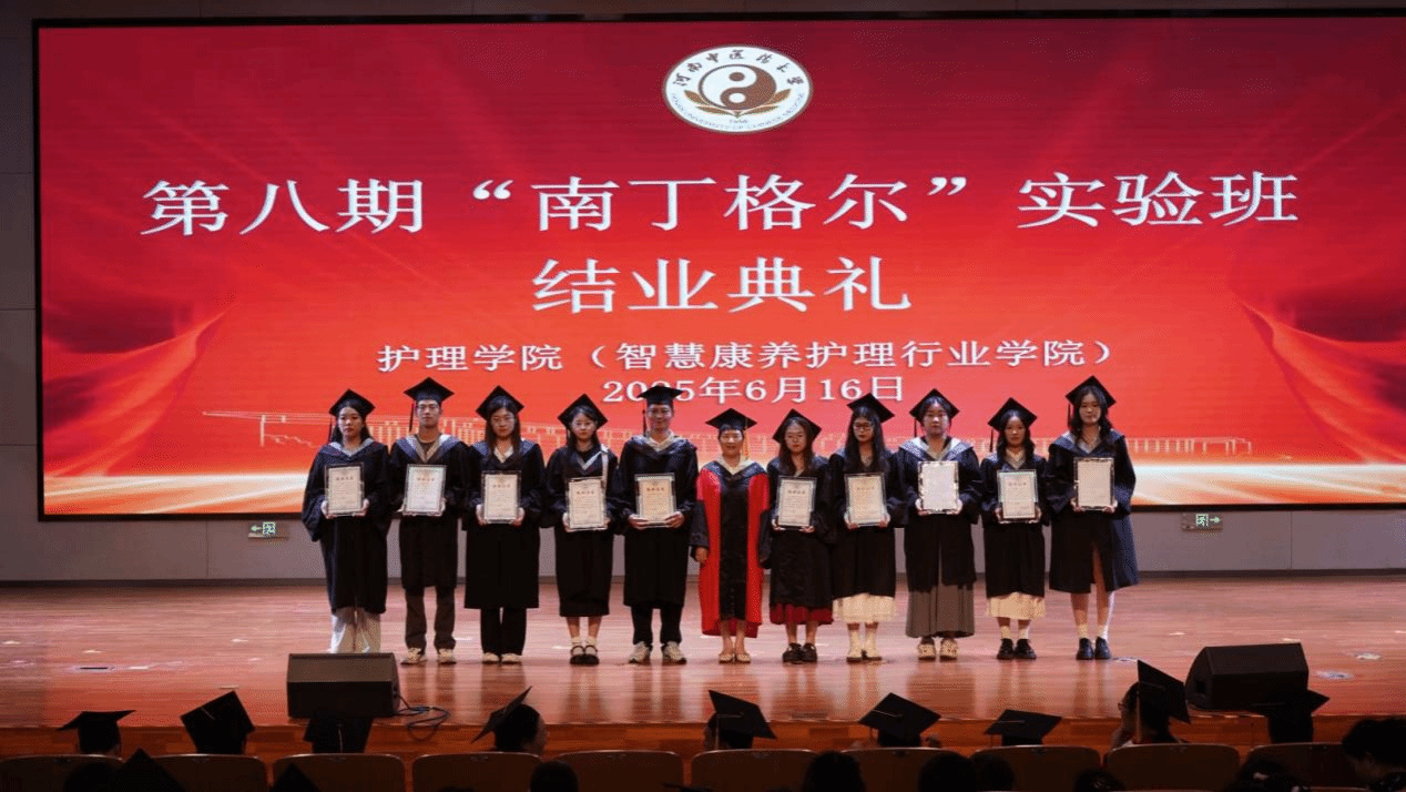 随后,宋静主任为第八期“南丁格尔”实验班结业学员代表颁发结业证书;学院班子成员及导师代表为2025届优秀毕业生代表颁发荣誉证书并赠送纪念品,为毕业生联络员颁发聘书,为毕业生代表颁发国家学生体质健康标准等级证书,最后班子成员及导师代表为硕士毕业生、本科毕业生扶正流苏并合影。