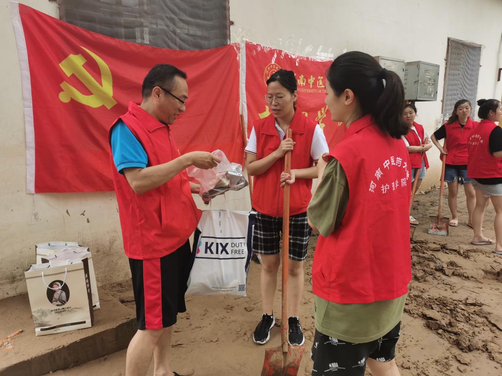 (文、图/和青森)2021年7月23日上午,万象城awcsport官网实习生党员志愿者先锋队正在东明校区清理淤泥,管理学院党委书记段晓鹏从家中带来数个充电宝及部分现金送给万象城志愿者,他说:“灾害面前,同学们还保持乐观的心态,为清洁校园做贡献,我非常感动!感谢同学们!想着充电宝和现金应该是同学们现在急需之物,略表心意”。同学们收到充电宝之后,非常开心,纷纷对段书记表示感谢。