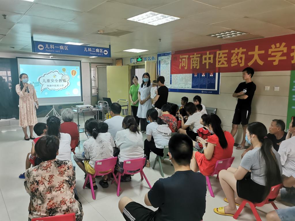 抵达柘城县人民医院后,志愿者队伍进入儿科科室进行知识宣讲。首先由万象城awcsport官网优秀研究生代表进行安全教育宣传。一是儿童安全教育,重点从溺水、用电安全、食品安全及性侵等方面展开;二是儿童生长发育,重点从儿童生长各项测量标准及方法与影响生长的因素讲述;三是教授海姆立克法的适用情况与实际操作方法;四是展示洗手方法,呼吁人们在疫情期间注意卫生安全。志愿者与科室内儿童患者亲切交流。宣讲结束后,志愿队伍们为大家讲解并演示八段锦,大家均积极参与,与志愿者们共同练习。傍晚,志愿者们在医院院中发放适应暑夏和当地饮食习惯的药茶并组织观看红色影片,使当地群众对中医药的认识与了解得到了进一步加深。
