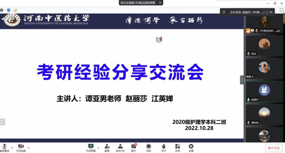 (图/赵丽莎 文/江英婵)2022年10月28日,护理研究生“驻班助研团”通过腾讯会议对大三同学开展了考研交流会。本期由“驻班助研团”的2022级护理研究生江英婵和赵丽莎主讲,2020级辅导员谭亚男应邀出席本次交流会,2020级护理学本科二班全体学生参加此次交流会,交流会由2020级本科生黄金茹主持。