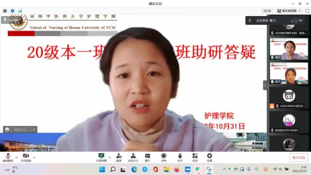 (图/李竹 文/曹宁)2022年10月31日,护理研究生“驻班助研团”通过腾讯会议对大三同学开展了考研交流会。本期由“驻班助研团”的2022级护理研究生李竹和曹宁主讲,2020级护理学本科一班全体学生参加此次交流会,交流会由2020级本科生晁金凤主持。