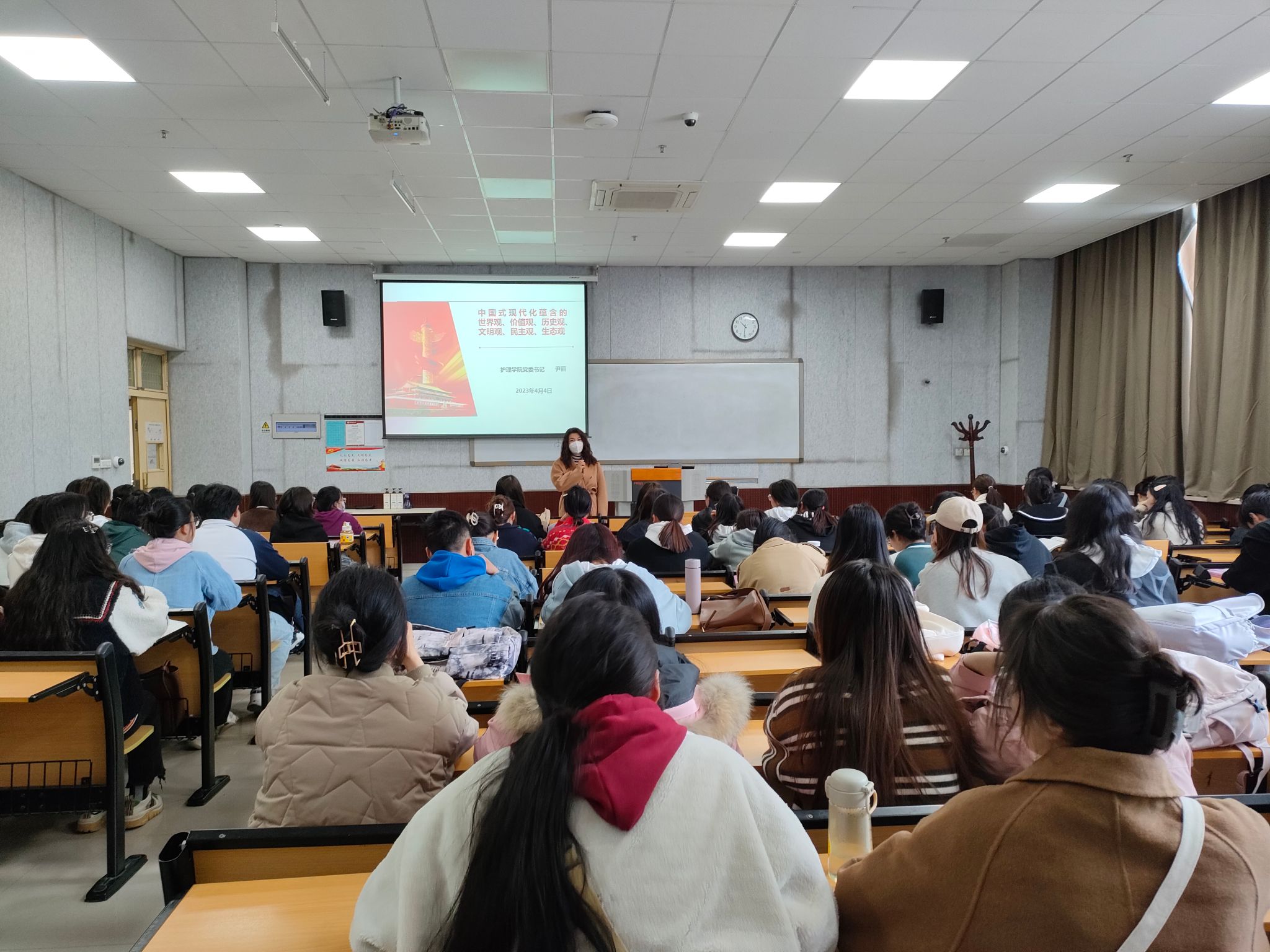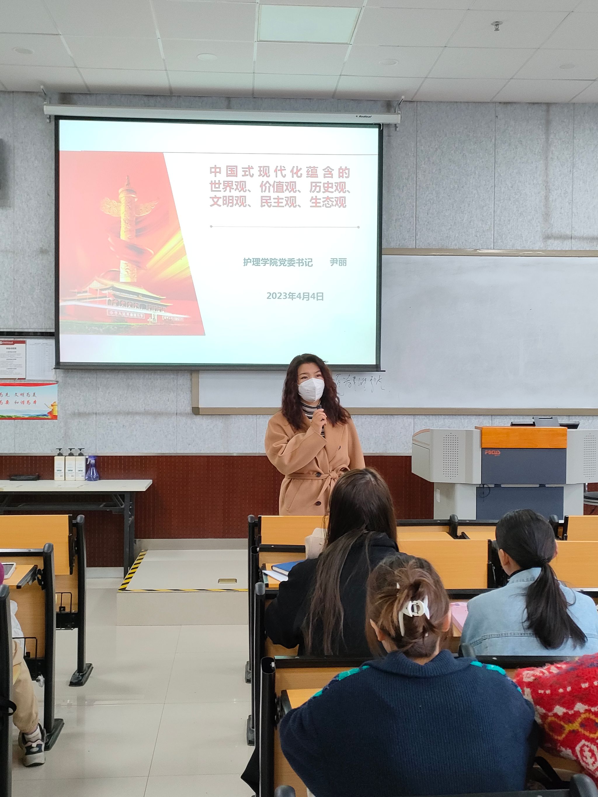 尹丽以《中国式现代化蕴含的世界观、价值观、历史观、文明观、民主观、生态观》为题,围绕习近平总书记的系列重要讲话,强调中国式现代化理论是党的二十大的一个重大理论创新,是科学社会主义的最新重大成果。结合中国社会主义发展史,对比世界现代化的历史进程,分别从世界观、价值观、历史观等六个方面展开讲解,深入阐述中国式现代化的中国特色、本质要求和重大原则。在交流互动环节中,尹丽以2020级班主任的身份,关心了解同学们近期的学习生活情况,引导同学们要关注国家大事,深入学习党的二十大报告,深刻领悟中国式现代化的丰富内涵,提高认知、把握要点、胸怀大局,运用科学理论推动工作实践。