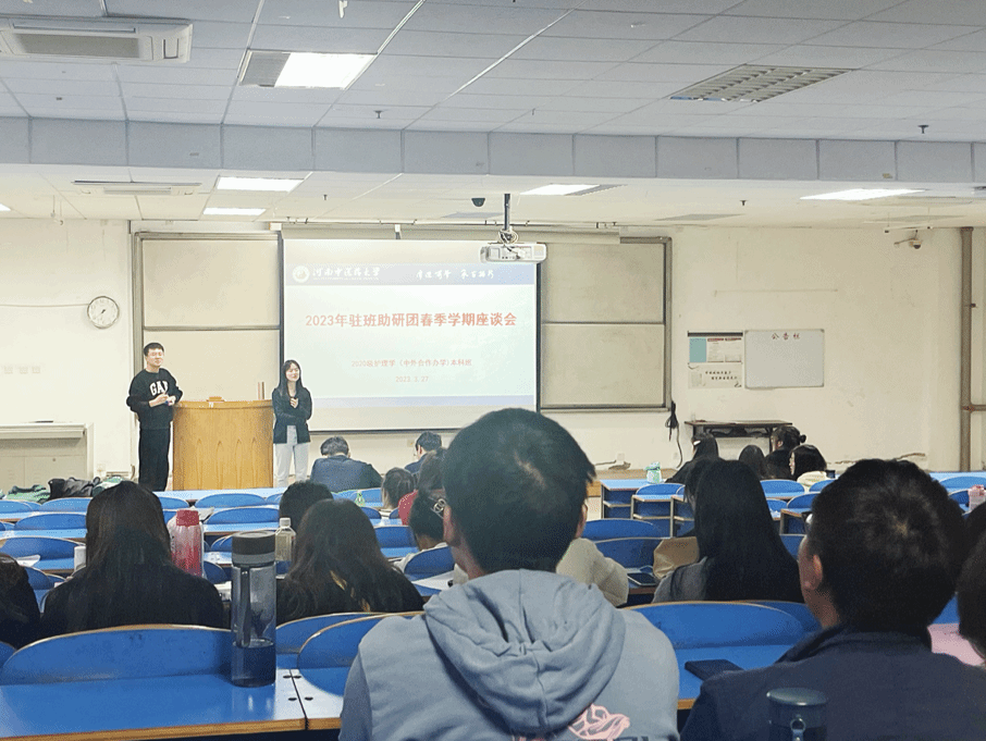 (图/薛琳洁 文/贾松波)2023年4月3日,护理研究生“驻班助研团”在四楼阶梯教室与2020级护理学中外合作办学本科班开展了考研实习交流会。本期由“助班驻研团”的2022级护理研究生贾松波、王慧欣、周晓敏、王宏宇主讲,2020级护理学中外合作办学本科班全体同学参与此次座谈会,由2020级本科生郭倚辰主持。