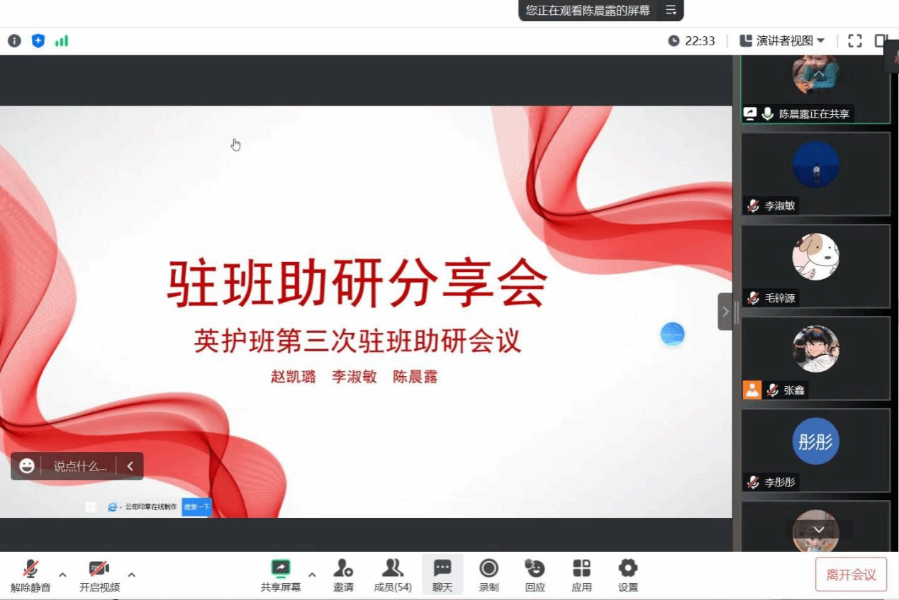 (图/李淑敏 文/陈晨露)2023年5月17日下午,护理研究生“驻班助研团”在线对2020级英护班开展了考研实习交流会。本期由“助班驻研团”的2022级研究生赵凯璐、李淑敏、陈晨露、王真真主讲,2020级英护本科班全体同学参与此次座谈会,会议由研究生李淑敏主持。