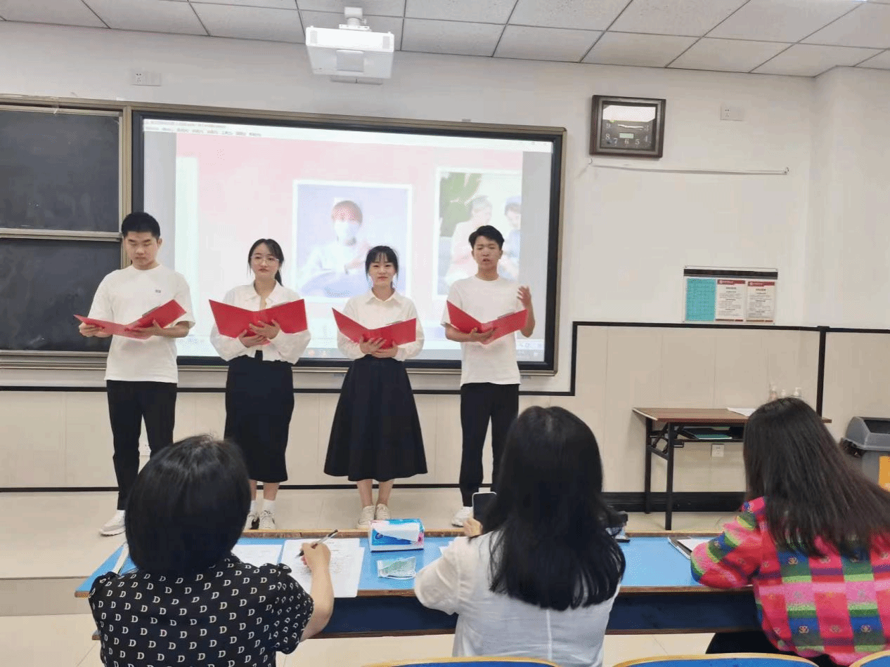 五个小组进行了精彩的展示,第一组《身披白衣,与生命同行》由曹宁、赵凯璐和李竹同演讲,情感饱满;第二组《因为有爱,所以责任》由李晶晶、杨贝贝和李淑敏同学演讲,句句铿锵;第三组《生命的太阳》由贾松波、王真真、王宏宇、孙献和陈晨露同学演讲,排队整齐,情感充沛;第四组《白衣天使,生命之光》由武俊超、周晓敏和王慧欣同学演讲,声音细腻;第五组《燕尾如薪火》由马若嘉、江英婵、张琦和朱天顺演讲,舞台设计精心,情绪高涨。刘玲霞副院长、吕素老师、高山老师作了点评,鼓励大家继续保持昂扬的精神风貌,衷心热爱护理事业,珍惜眼前宝贵的学习机会。本次评选第五组马若嘉、江英婵等获优异表现奖。