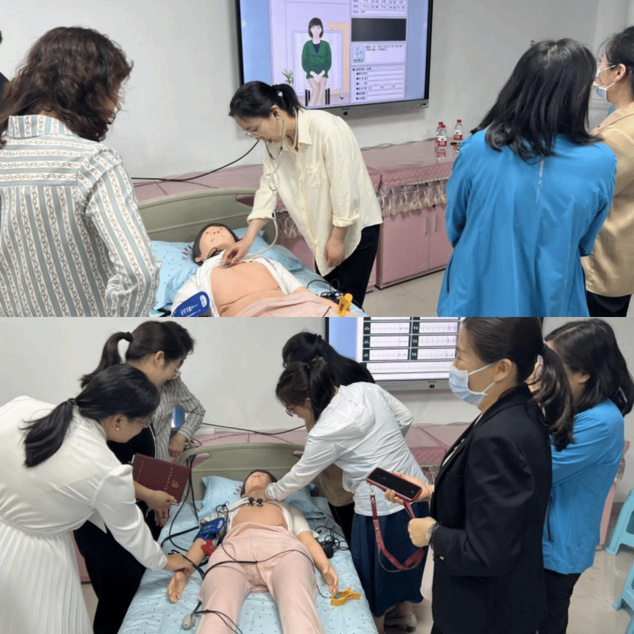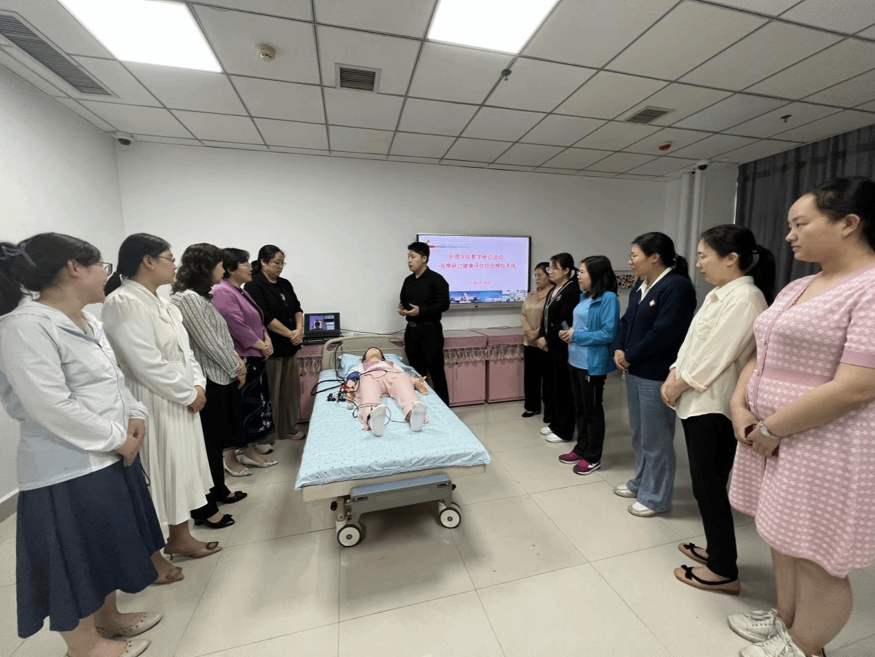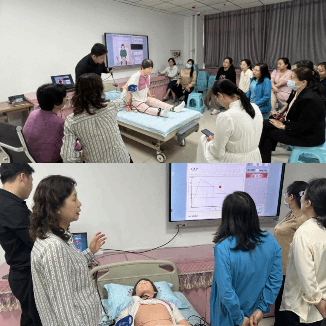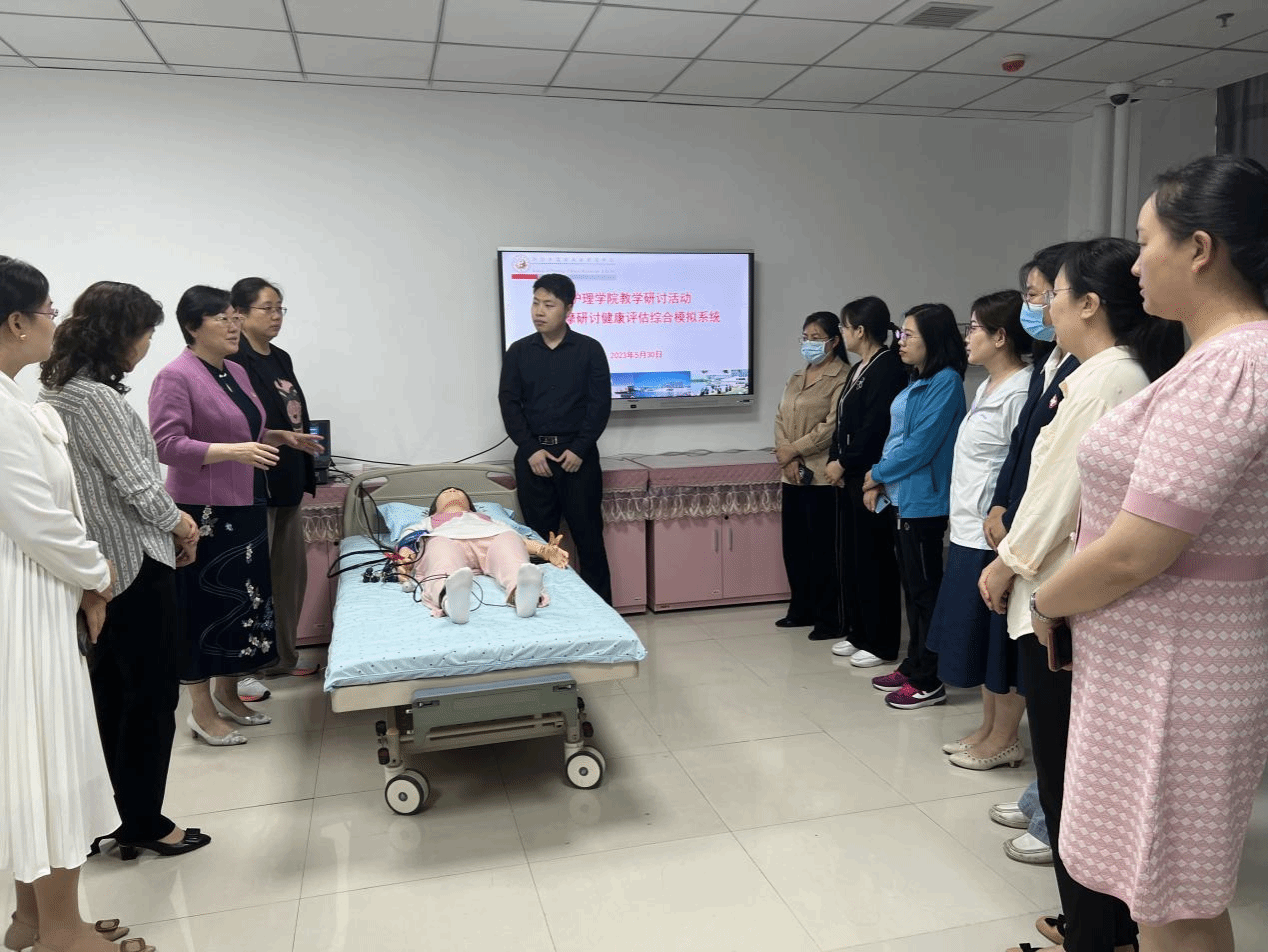 首先,秦元梅副院长介绍了本次教研活动的目的。健康评估综合模拟系统主要运用于健康评估、内科护理以及替代SP(标准化病人)病人使用,该设备也是2021年第十届全国大学生医学技术技能竞赛决赛(护理赛道)产品,该设备研发工程师对该系统进行详细的讲解与操作演示,该模型具备问诊查体所需要的基本生命体征,可以进行模拟问诊病人主诉的操作,满足视触叩听的医学诊断手法,以及瞳孔反射、脉搏、血压、心脏杂音、呼吸音和肠鸣音等等。是目前国内实验设备中第一个可以实现肠鸣音听诊的模拟人,可以达到和真人听诊无差异的水平,还可以完整呈现12导联心电图;模拟人系统内部带有三种系统模式,可以进行预设病例的模拟训练、也可以自定义编辑病例和进行单项训练。随后老师们围绕系统功能、教研室教学中实际教学痛点针对性地提出了专业意见,并依据综合模拟人进行实操并结合教学需求提出系统进一步研发的方向,设备工程师对教师提出的疑问给予耐心的解答,研讨现场学术氛围浓厚。