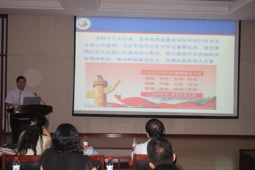 首先,刘部长讲解了什么是价值观、什么是核心主义价值观、以及社会主义核心价值观和“三个倡导”核心价值观的形成过程,并举例让大家了解了一些国内外价值观的内容。指出“核心价值观其实就是“德”,既是个人的德,也是一种大德,就是国家、社会的德。国无德不兴,人无德不立。”“使每个人都能感知它、领悟它,内化为精神追求,外化为实际行动,做到明大德、守公德、严私德。”随后从一种新态势、一个新特点、一项新课题三个方面对践行社会主义核心价值观的重要性和紧迫性进行分析,并用大家熟悉的名言、歌曲,生活中的薯片、芯片、影片等例子增强大家对践行社会主义核心价值观重要性的认识。最后,刘部长指出党员干部、青少年和公众人物应该是培育和践行社会主义核心价值观的重点人群,从修身、齐家、治国三个方面教导大家如何更好去践行社会主义核心价值观:应该从读书、慎独慎微、不忘初心三个方面修身,做理想信念的坚定者;在家庭中懂得知恩、感恩、报恩而齐家,做家风建设的示范者;在工作中洗好“三盆水”、照好“四面镜”而治国,做知行合一的先行者。