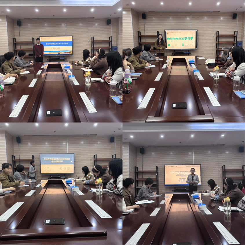 首先,吕素老师指出,硕博论坛活动有利于提高研究生文献阅读能力及科研基础水平,是锻炼同学们胆识及演讲能力一个很好的学习方式。随后,4位研究生依次进行了演讲汇报。车易展分享了《德尔菲法概述及其统计分析指标》,为大家介绍了一种在面对高度不确定性、复杂性的环境时能够做出预测或推断的方法;关家怡分享了《系统评价再评价的学与思》,详细讲解了优化护理管理和提高护理服务质量的决策依据;段淑婷分享了《灸法在脊髓损伤后神经源性膀胱中的应用进展》,为大家介绍了灸法的适用范围及作用机制;赵凯璐分享了《Outcomes of online mindfulness-based cognitive therapy for patients with residual depressive symptoms:A randomized clinical trial 》,给大家分享了采用正念认知疗法治疗残余抑郁症状患者的一项随机临床试验。四位同学汇报后,谷云鹏老师从演讲内容、PPT制作和汇报技巧等方面做了详细的点评。最后,通过学生匿名投票、评委评分,本次硕博论坛院内选拔评选2022级研究生赵凯璐为此次选拔赛第一名。