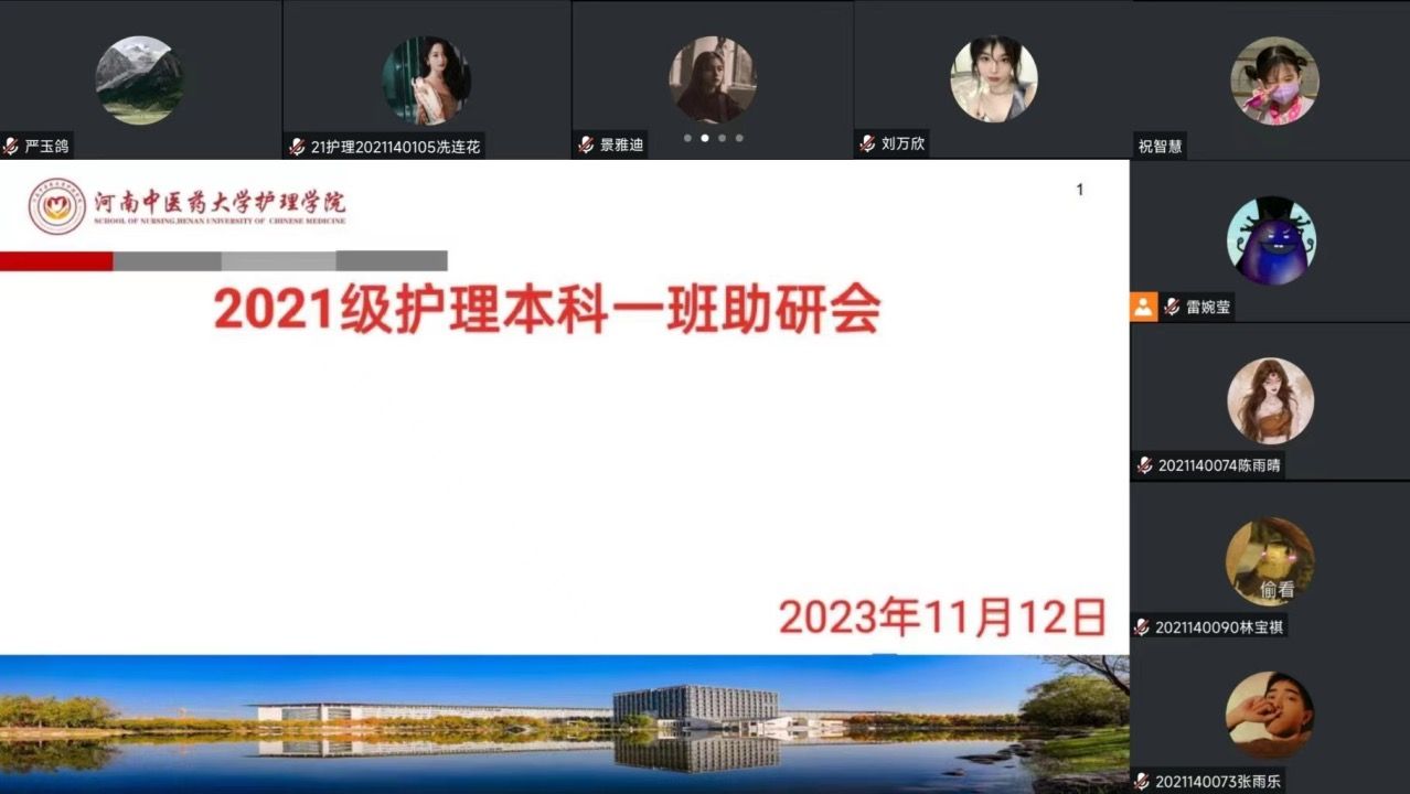 本网讯(文/图 严玉鸽)2023年11月12日,护理研究生“驻班助研团”依托腾讯会议平台对大三同学开展了考研交流会,本期由2023级“驻班助研团”的雷婉莹、严玉鸽、祝智慧、乔婷婷、腾菲、郝丹诗主讲,2021级护理学本科一班全体学生参加此次交流会。