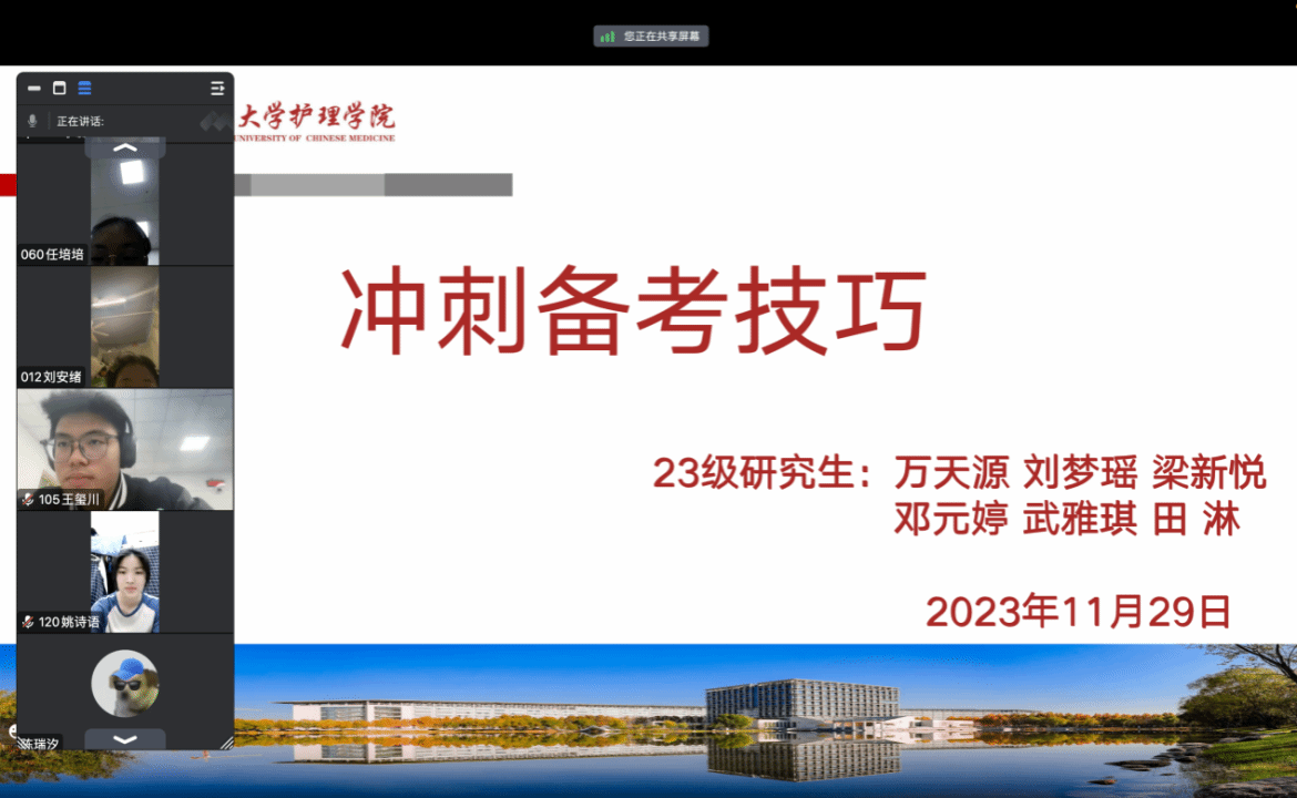 本网讯(文/邓元婷 图/刘梦瑶)2023年11月29日,护理研究生“驻班助研团”为大三同学线上开展了考研交流会,本期由2023级“驻班助研团”的万天源、刘梦瑶、梁新悦、邓元婷、武亚琪、田淋主讲,2021级护理学本科(中外合作)班全体学生参加此次交流会。