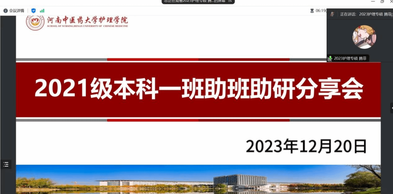本网讯(文/图 郝丹诗)2023年12月20日,护理研究生“驻班助研团”依托腾讯会议平台对大三同学开展了考研交流会,本期由2023级“驻班助研团”的乔婷婷、腾菲、郝丹诗、雷婉莹、严玉鸽、祝智慧主讲,2021级护理学本科一班全体学生参加此次交流会。