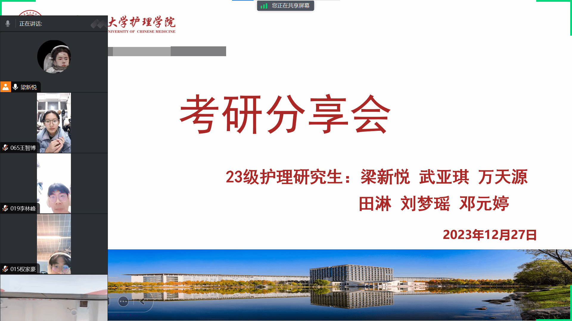 本网讯(文/刘梦瑶 图/梁新悦) 2023年12月27日,护理研究生“驻班助研团”依托腾讯会议平台对大三同学开展了考研交流会,本期由2023级“驻班助研团”的梁新悦、武亚琪、万天源、邓元婷、田淋、刘梦瑶主讲,2021级护理学(中外合作办学)本科班全体学生参加此次交流会。