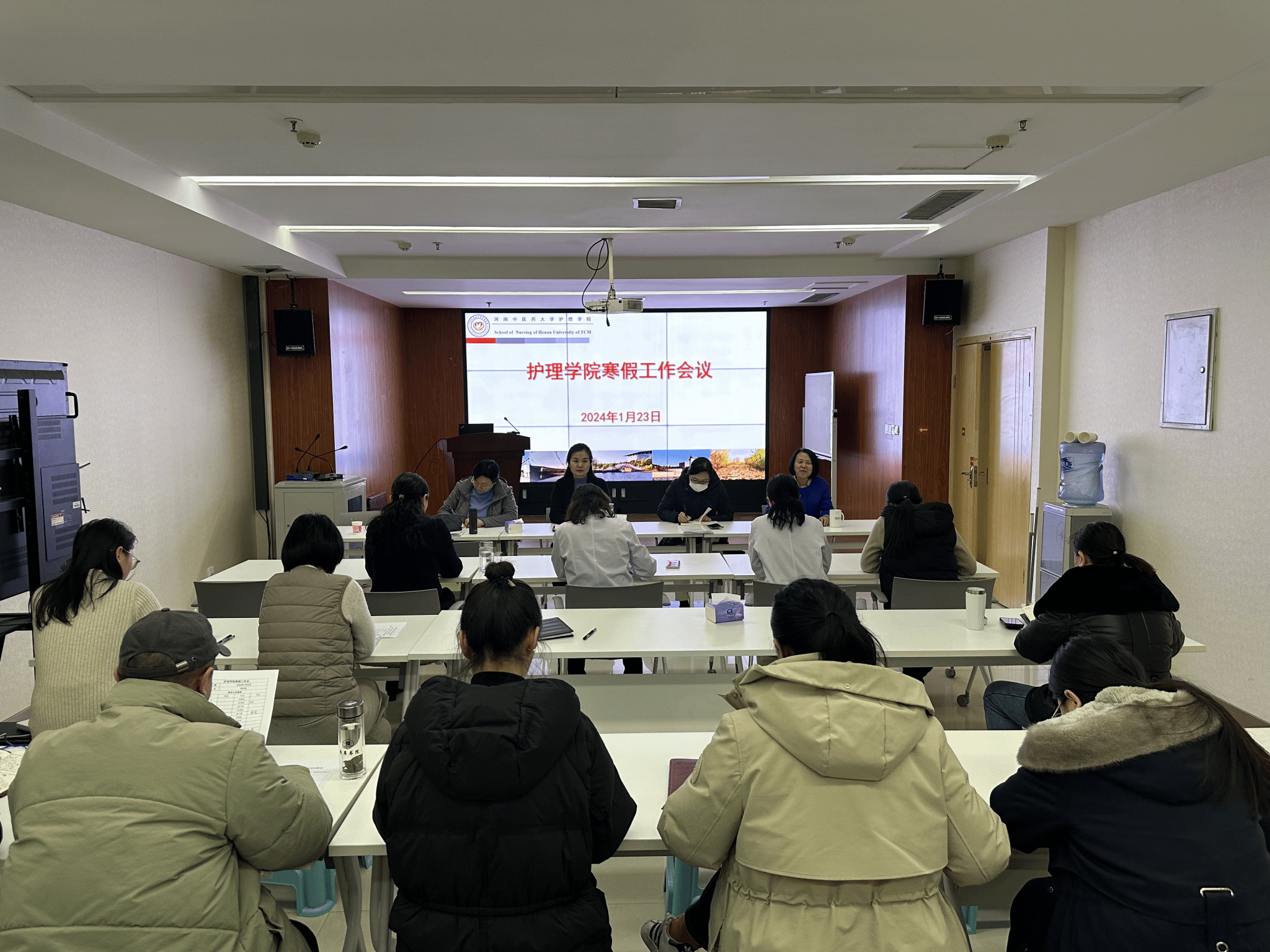 院长曹珊强调了期末及寒假期间工作:1.要做到坚守岗位,高质量完成期末收尾工作,科学合理安排寒假工作,做到放假不放松,工作不断线;2.针对安全工作,指出要进一步强化责任意识,做好学生宿舍、实训室及各办公室全覆盖安全隐患排查及假期值班巡查工作,时刻绷紧安全弦,坚守平安底线;3.依据专业认证标准对本学期所有教学材料进行整理和审核,为护理专业认证入校考察做好相关准备;4.充分利用假期做好2024年度国家自然科学基金等项目申报准备工作。同时,传达了全国教育教学大会及万象城教育教学大会会议精神,强调要深刻理解国家围绕2024年教育教学工作重点任务所进行的七大部署,牢记立德树人根本任务,坚持“四个回归”,大力培养德智体美劳全面发展的高质量护理专业人才。