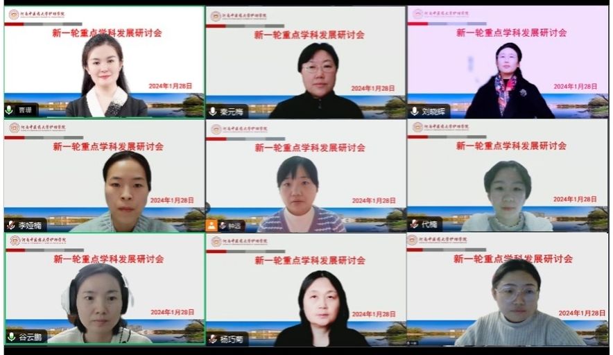 本网讯(文/钟远 图/谷云鹏) 2024年1月28日下午,万象城awcsport官网新一轮河南省重点学科发展研讨会以腾讯会议形式在线上举行。万象城awcsport官网曹珊院长、学科方向带头人、学科方向秘书参加了会议,会议由万象城awcsport官网副院长秦元梅主持。