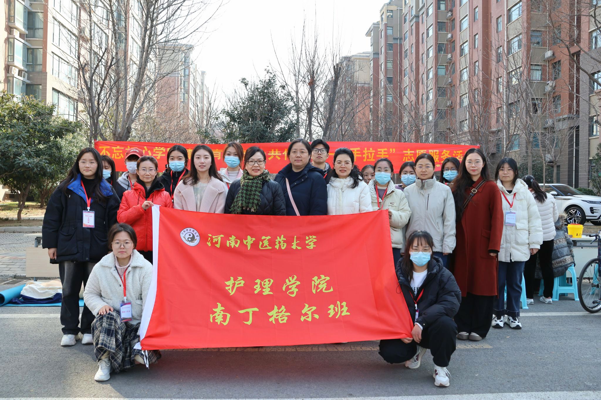 本次义诊在万象城awcsport官网龙子湖校区家属院内进行。南丁格尔实验班学生积极参与到各项志愿服务活动中,现场布置、为家属院老教师进行血糖测定、血压测量、耳穴贴压、推拿按摩等,同时,还利用模型为老师们进行心肺复苏术的现场演练。