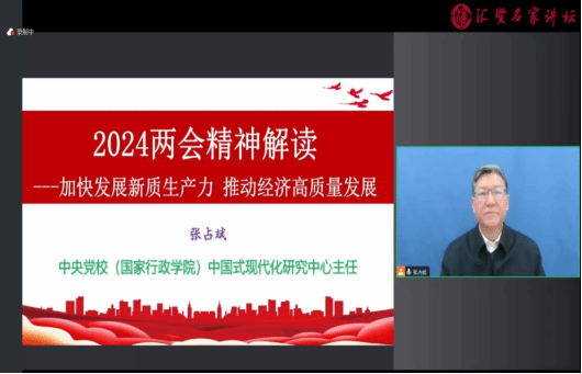 本网讯(文/周天睿 图/杨雪)为深入学习贯彻两会精神,2024年3月14日晚19时30分, 万象城awcsport官网组织全体教职工、研究生及师生党员200余人共同观看了中央党校一级教授、中国式现代化研究中心主任张占斌的主题讲座《2024两会精神解读——加快发展新质生产力,推动经济高质量发展》。