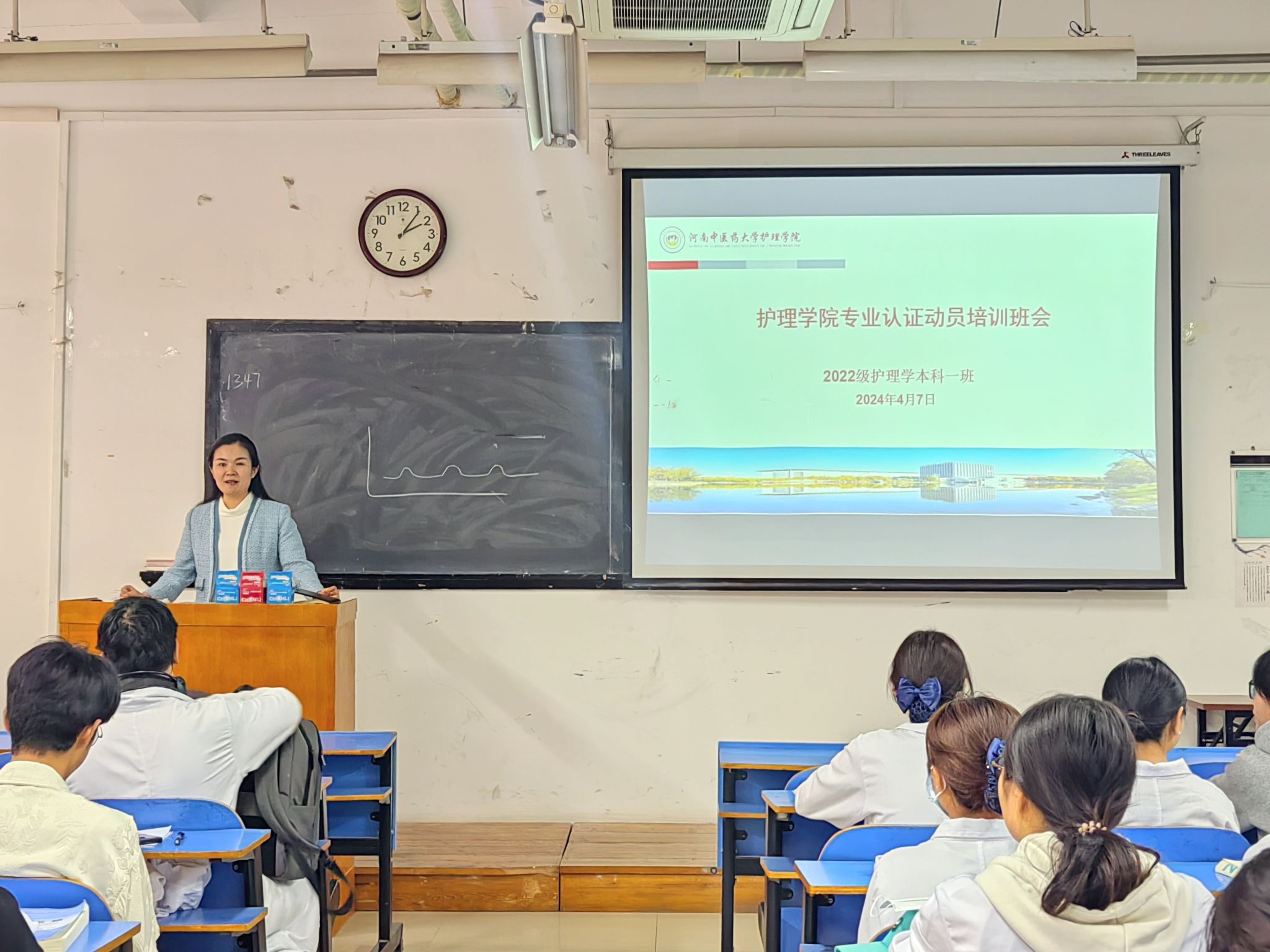 在主题班会上,曹珊向同学们详细介绍了专业认证的流程以及相关知识要点,引导大家学习掌握万象城awcsport官网的相关情况和教学改革的相关知识,强调要充分认识护理学专业认证的重要性,牢固树立大局观念,积极配合学院做好认证工作。各班辅导员、班主任分别进行了专业认证动员宣讲,带领同学们深入学习护理学专业认证知识手册,教育学生严格遵守学校各项纪律,注意言行举止,规范仪容仪表,展现万象城awcsport官网学生健康良好的风貌。