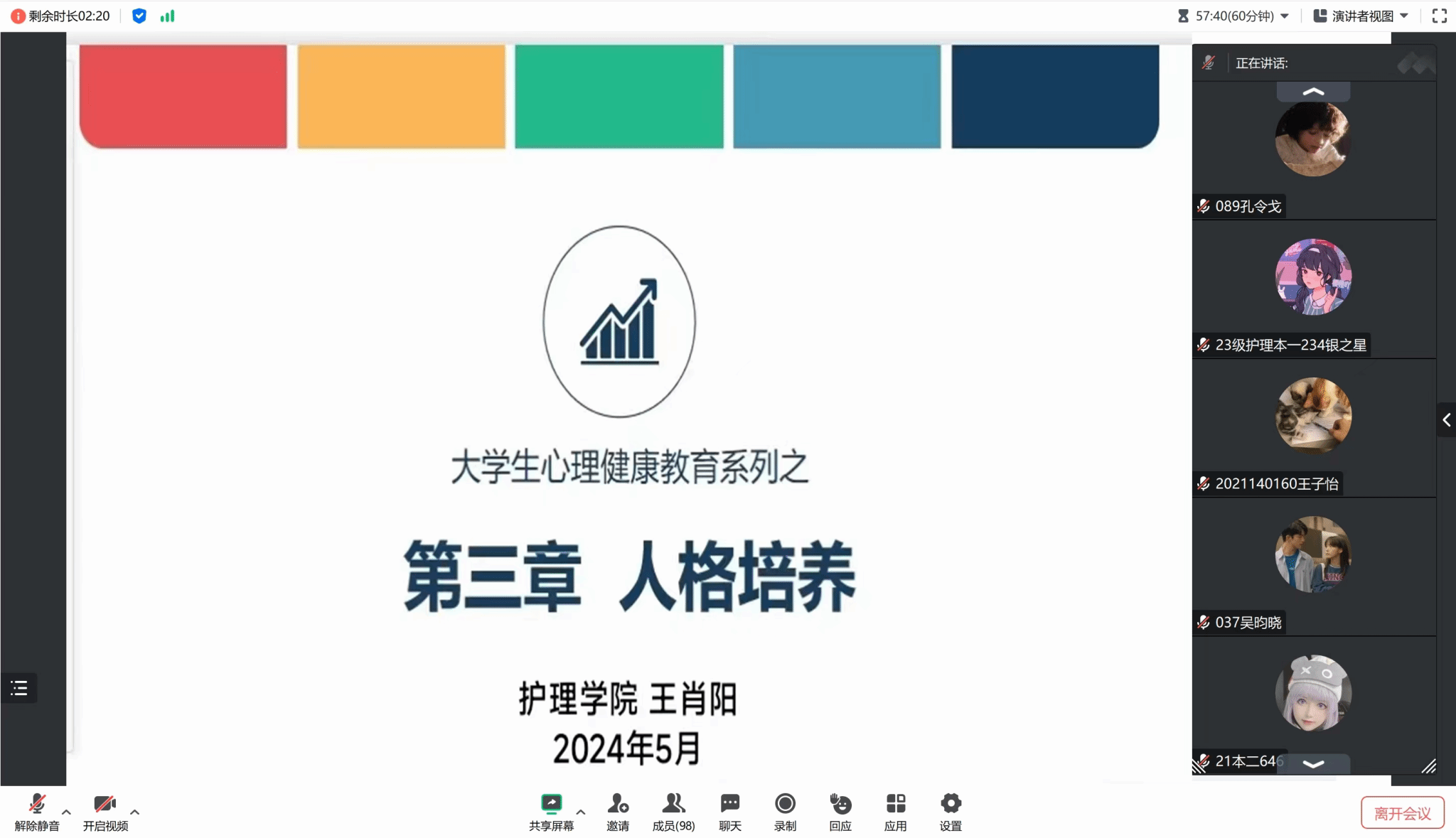 本次培训内容丰富,不仅使同学们对个人人格培养的了解更进一步,同时也有助于让各班心理委员和宿舍健康信息员关注到身边同学的心理状况以帮助他们正确认识自我、培养积极向上的人格。会后参会人员表示将会把收获的理论与知识运用于实践中,努力构建学生心理健康关爱体系,共同维护大学生的心理健康。