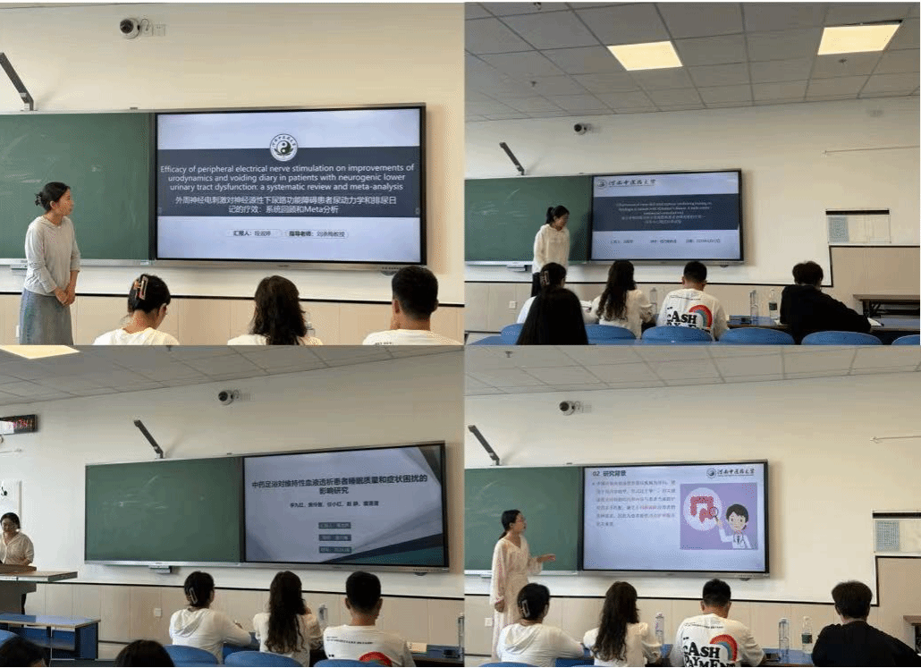 2023级4位研究生依次进行了文献精读汇报,段淑婷分享的文章《Efficacy of peripheral electrical nerve stimulation on improvements of urodynamics and voiding diary in patients with neurogenic lower urinary tract dysfunction: a systematic review and meta-analysis》,探讨了在外周神经电刺激对神经源性下尿路功能障碍患者尿动力学和排尿日记改善的疗效meta分析。刘莹莹分享的文章为《Effects of hospital-family holistic care model on the health outcome of patients with permanent enterostomy based on the theory of ‘Timing It Right’》,探讨了时机理论对永久性肠造口患者健康结局的影响。闵丽军分享的文章为《Effectiveness of nurse-delivered stepwise swallowing training ondysphagia in patients with Alzheimer's disease: A multi-centerrandomized controlled trial》,介绍了一项基于逐步吞咽训练的阿尔茨海默病患者吞咽困难的有效性的研究。高浩然分享的文章为《中药足浴对维持性血液透析患者睡眠质量和症状困扰的影响研究》,介绍了关于中药足浴对于血液透析患者睡眠质量的改善情况。每位同学汇报后,特邀嘉宾王茜娜老师、张靖老师,高年级师兄贾松波、马若嘉分别从期刊信息、文献解读、阅读后的启发思考、科研成果如何与临床相结合、以及演讲注意事项方面进行了详细点评。本次读书报告会评选2023级研究生段淑婷为本期最佳汇报者。