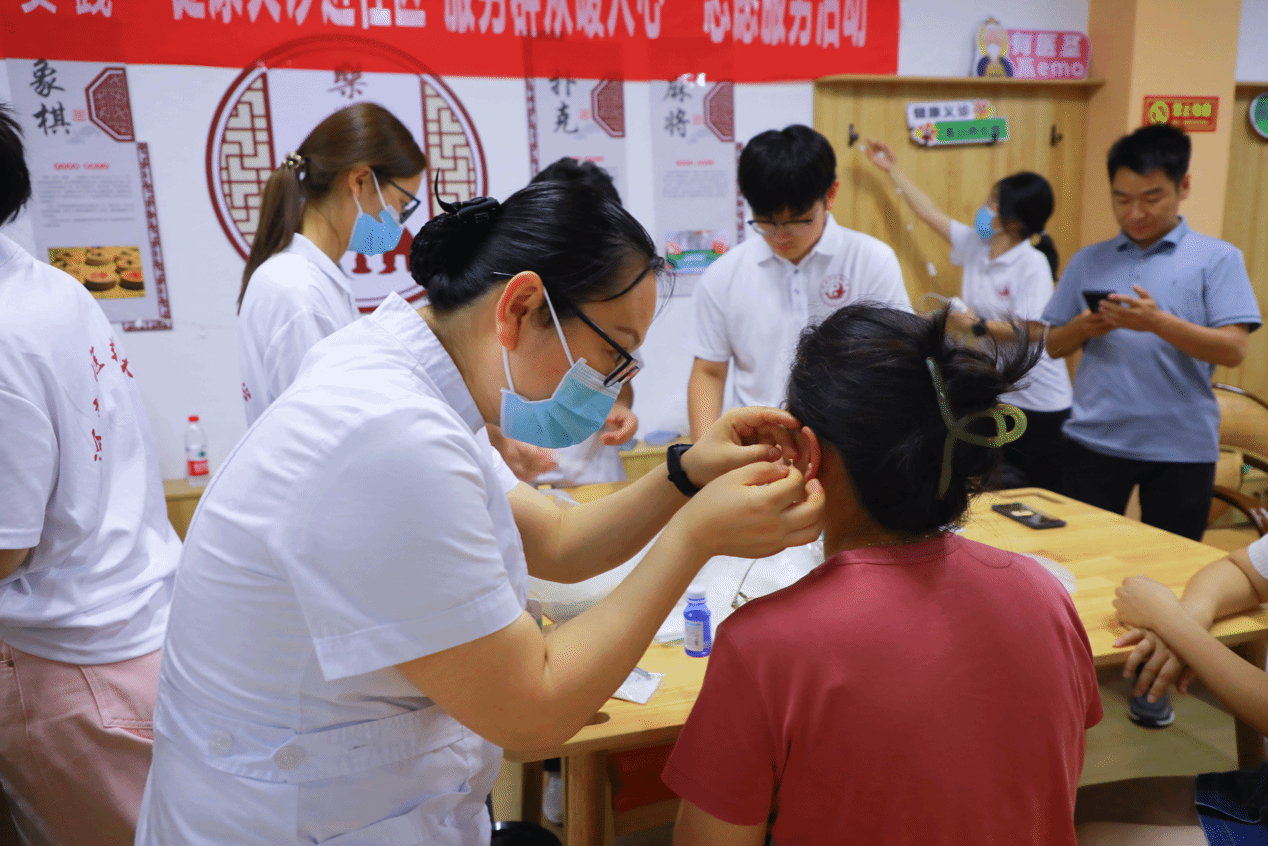 活动现场,志愿服务团成员为群众免费提供了血压、血糖检测、耳穴压豆、健康咨询等服务。主治医师王焱皙和主治护师崔晓宁也亲临现场,为居民们提供专业的中医服务。王老师以其精湛的医术,为居民们进行把脉问诊,耐心解答大家的健康疑问。而崔老师则专注于耳穴压豆、贴三伏贴、刮痧等中医治疗,为居民们带来了舒缓身心的中医体验。