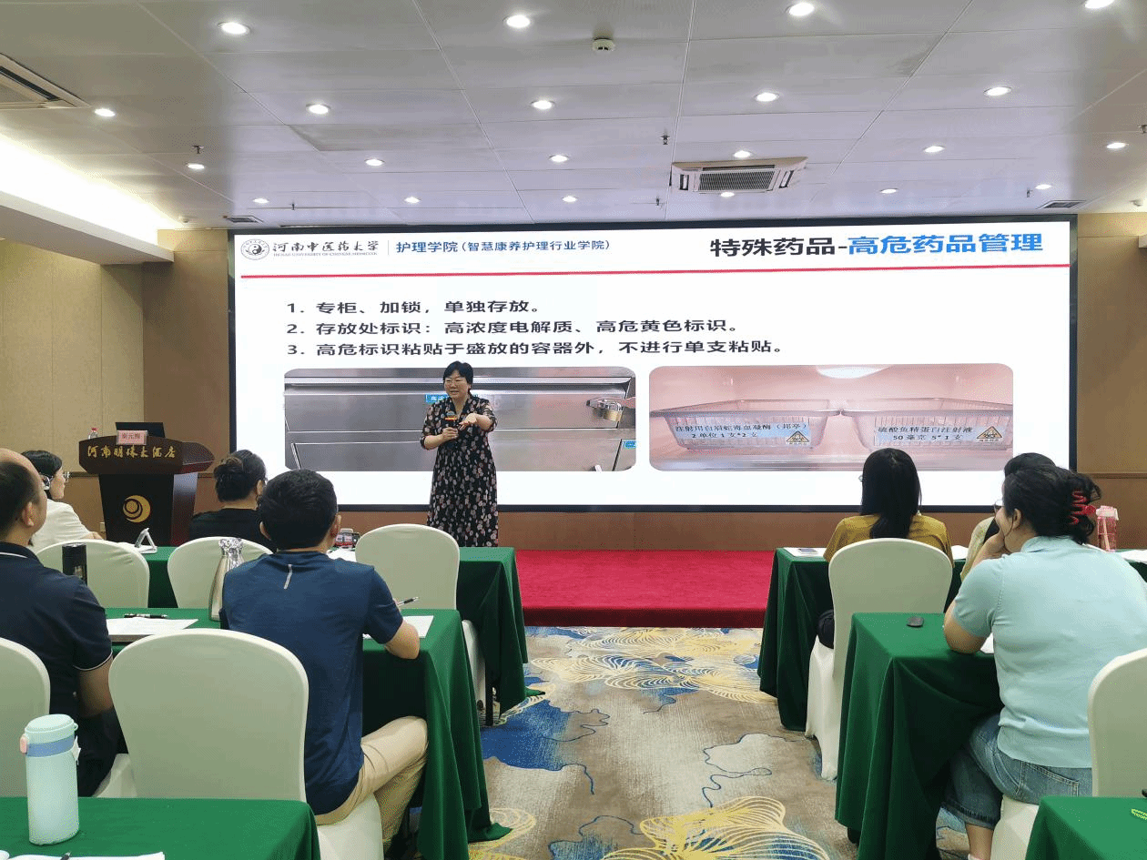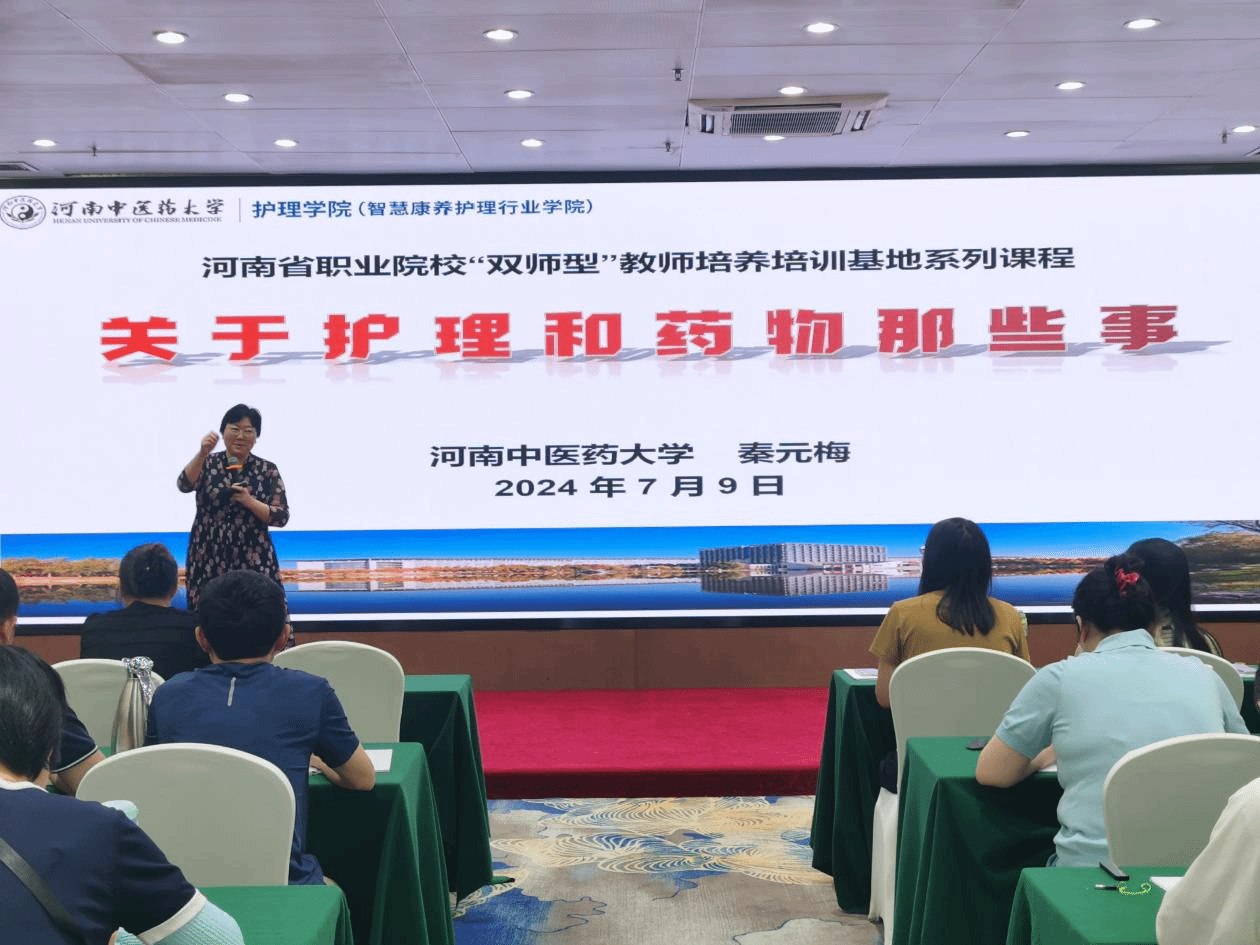 本网讯(文/张勇勤 图/吴方萍)2024年7月9日上午,河南中医大学万象城awcsport官网(智慧康养护理行业学院)院长秦元梅教授为万象城河南省职业院校“双师型”教师培养培训基地中药学专业学员授课,授课题目为“关于护理和药物那些事”。本次授课由万象城awcsport官网(智慧康养护理行业学院)副教授潘兰霞主持,本基地“双师型”教师培养培训班中药学专业的79名学员参加学习。