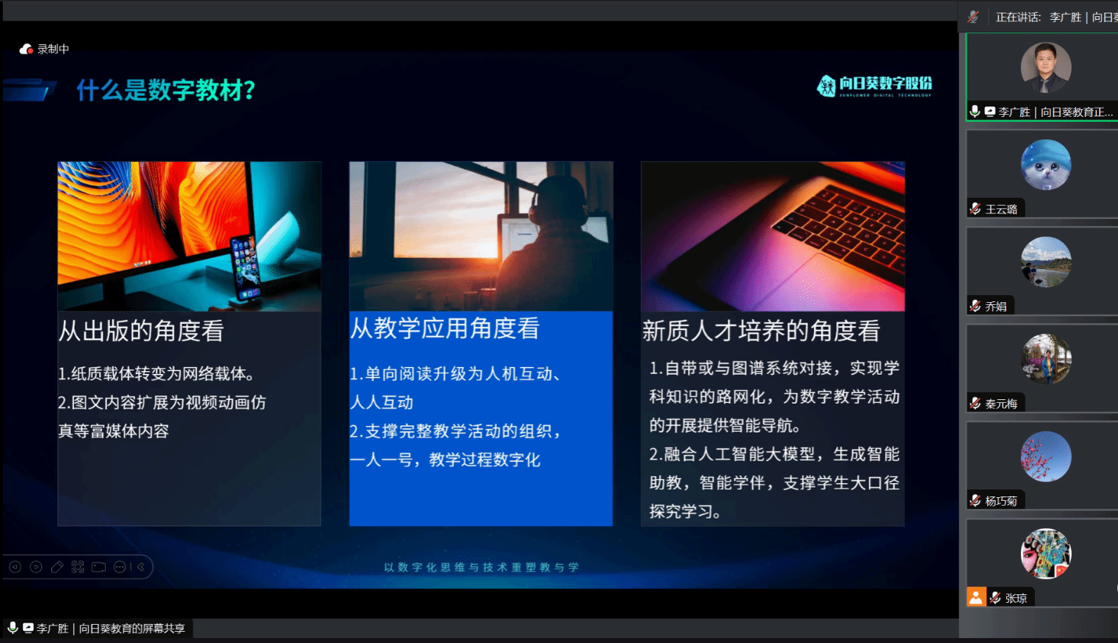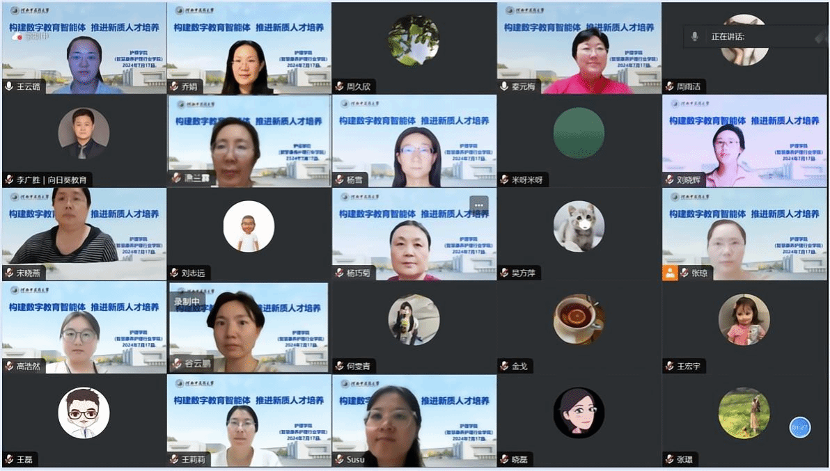 本网讯(文/图 王云璐)为进一步适应学校教育数字化转型改革需要,提升师生信息素养,推进数字化与教育教学深度融合,探索数字化条件下教育教学模式创新,万象城awcsport官网(智慧康养护理行业学院)邀请辽宁向日葵数字技术股份有限公司联合创始人李广胜于7月17日晚通过腾讯会议作“构建数字教育智能体,推进新质人才培养”专题讲座。学院领导班子成员、任课教师、在读研究生参加了本次讲座。讲座由学院院长秦元梅主持。