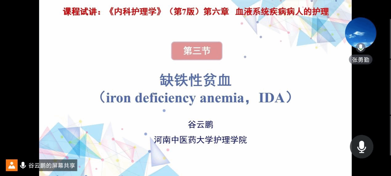 张勇勤教授首先介绍了新教师的基本情况,为帮助新教师成长提升,要求参会教师评委严格按照规定进行打分,并提出改进意见。接着,谷云鹏老师进行了《内科护理学》第六章第3节缺铁性贫血章节的课程试讲。试讲结束后参会教师评委从教学内容、重难点把握、教学设计、教学课件制作、语言表达等方面进行了详细点评。