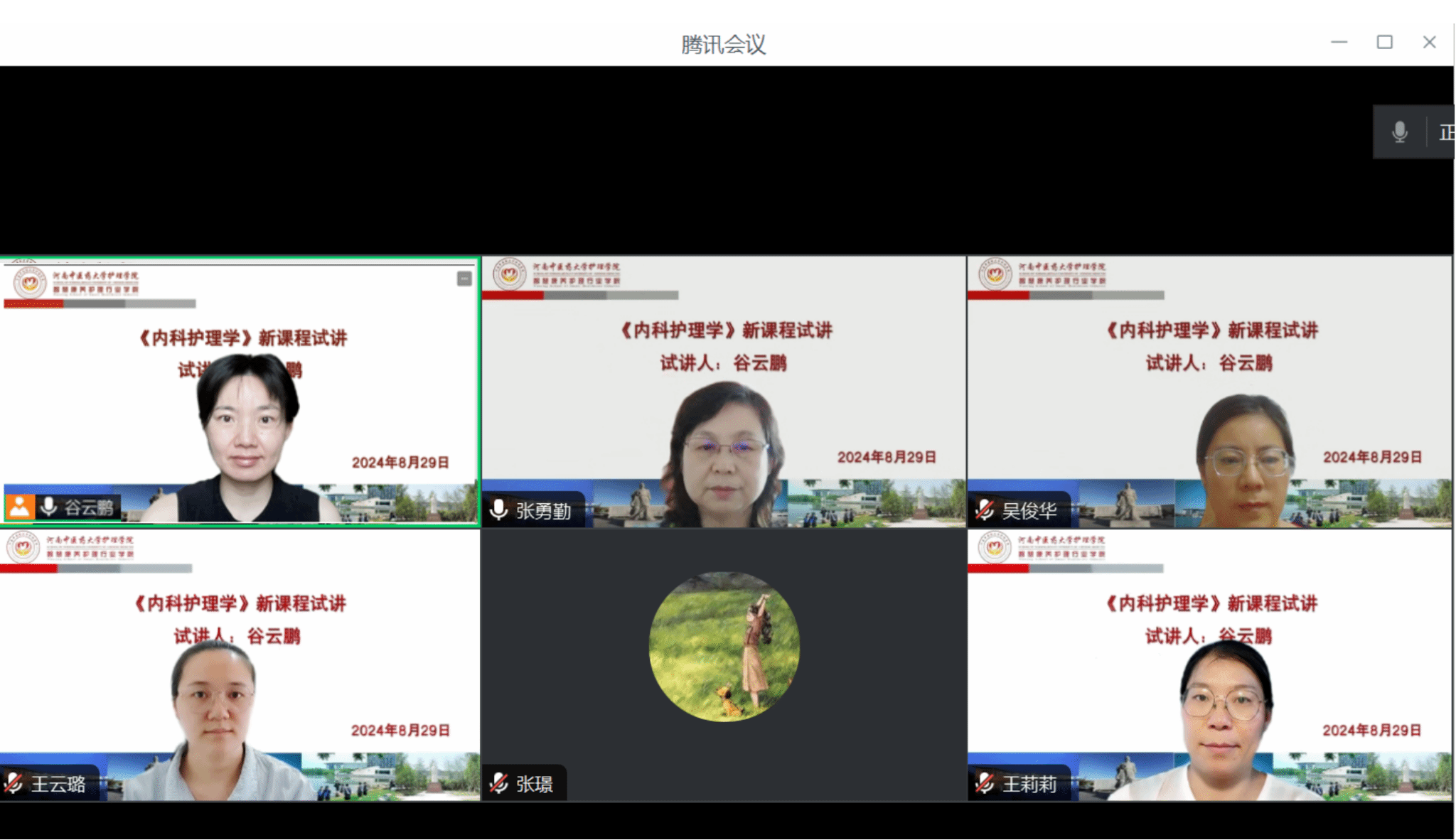 本网讯(文/图谷云鹏)2024年8月29日下午,内科护理学教研室通过腾讯会议进行了《内科护理学》新教师试讲,教学办吴俊华老师及内科护理教研室全体教师参加了会议,会议由教研室主任张勇勤教授主持。