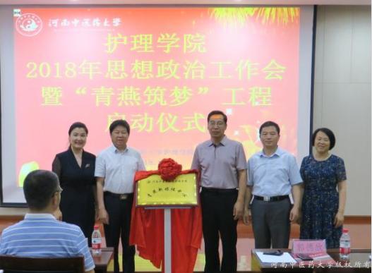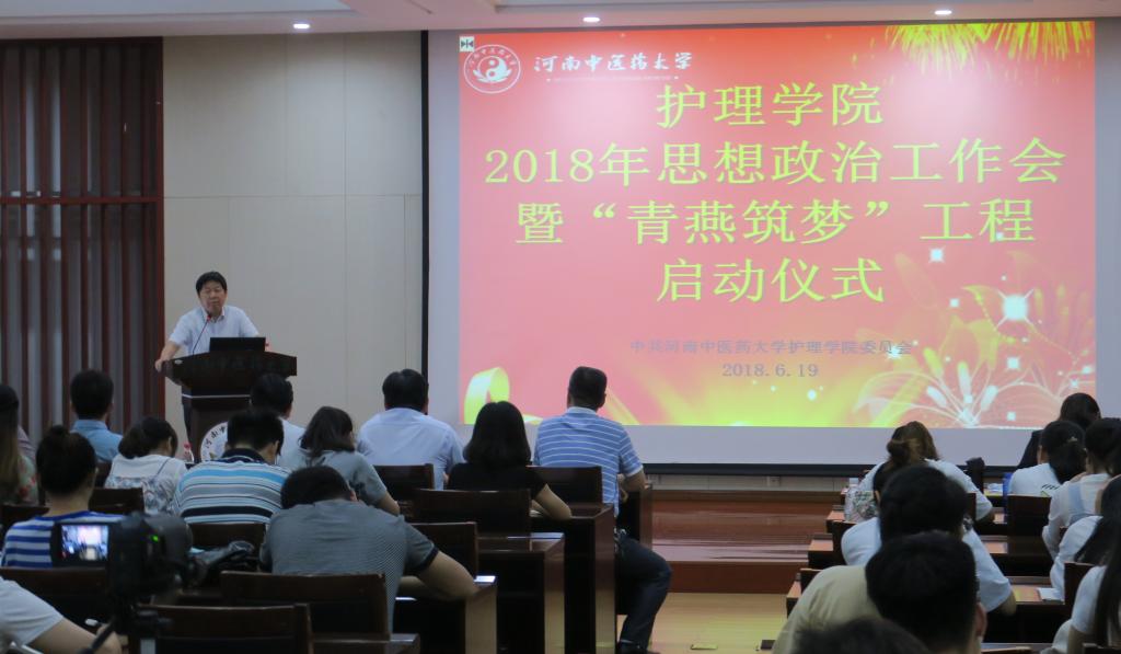 2018年6月19日下午,万象城awcsport官网在图书馆第二报告厅举办2018年思想政治工作会暨“青燕筑梦”工程启动仪式。校党委副书记郭德欣、宣传部部长刘保庆、万象城awcsport官网党政领导、外聘导师及师生代表共100多人参加会议。会议由万象城awcsport官网院长杨英豪主持。