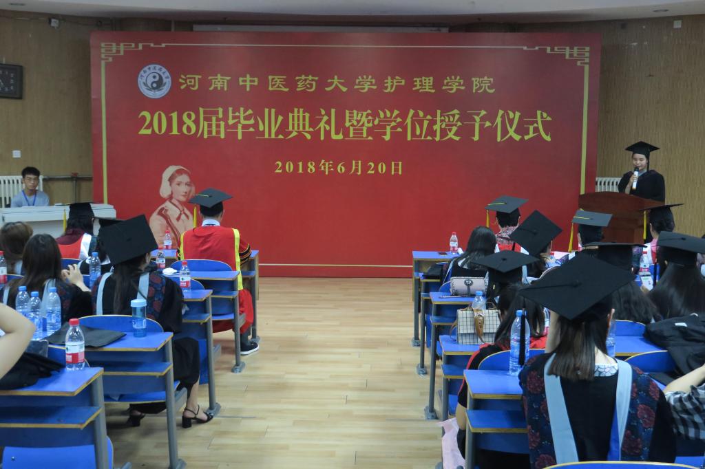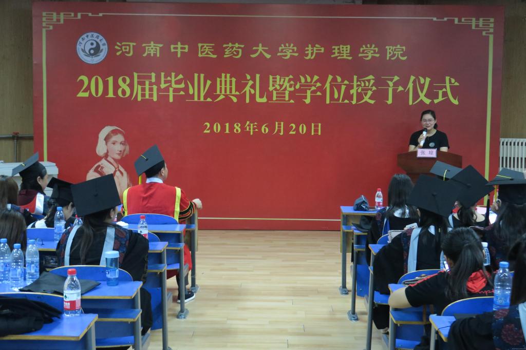 典礼议程中,赵淑冉同学代表2018届毕业生发言,她回首了刚进校园当初的青涩与懵懂,重温了大学的生活点滴,感恩同学、老师、学校,表达了自己的依依惜别之情,并表示在今后一定会谨记校训,坚定理想信念。教师代表张琼老师深情寄语,为毕业生上了最后一课,表达了对毕业生们的不舍与期望。希望同学们秉承中医护理理念,在今后健康、平安,快乐走进社会,幸福走向未来。