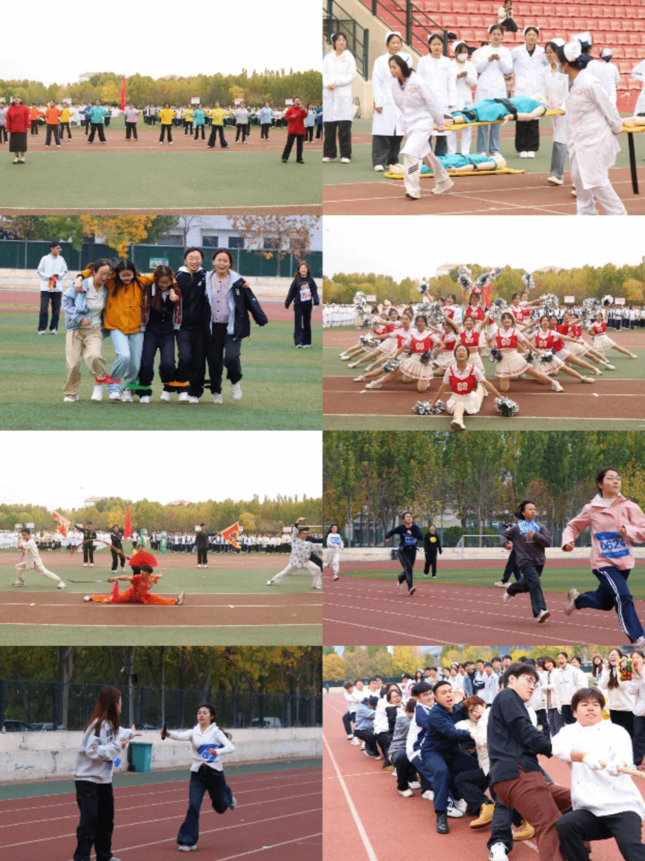此次运动会涵盖团体类、竞技类、趣味类、护理技能特色接力等10余项项目,学院师生齐上阵,共有400多名选手参加。各项竞赛如火如荼,激情四溢。跑步赛道上,选手们用速度诠释竞技精神,以汗水铸就赛场辉煌;三级跳区,选手们腾空而起,演绎了一场速度与激情的盛宴。师生趣味项目同样大放异彩:拔河赛场,力量与智慧交锋,彰显团队默契与力量;“一圈到底”,速度与策略并重,赢得满堂喝彩;“护理技能接力赛”让人耳目一新,通过端无菌盘、模拟担架搬运、模拟怀抱婴儿安全行走等“专业+趣味”的运动形式,激发了同学们对护理专业的真挚热爱。现场气氛热烈,观众席上掌声如潮、欢呼声此起彼伏……