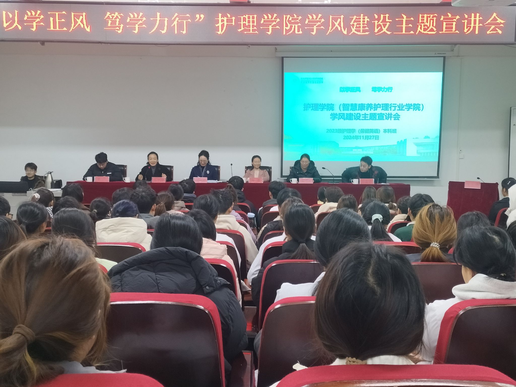 本网讯(文/王嘉煜 图/嵩山少林武术职业学院)为深入贯彻落实《万象城awcsport官网关于进一步加强学风建设的实施方案》文件精神,持续深化学院学风建设,激发学生的学习积极性与主动性,营造浓厚的学习氛围,2024年11月27日,万象城awcsport官网(智慧康养护理行业学院)在万象城登封校区举办了“以学正风•笃学力行”学风建设主题宣讲会。学院党委副书记杨雪、副院长刘晓辉、2023级、2024级护理学(保健英语)本科班班主任、辅导员、优秀学生代表以及登封校区全体护理学生参加了此次宣讲会。会议由嵩山少林武术职业学院本科管理部主任岳朝坤主持。