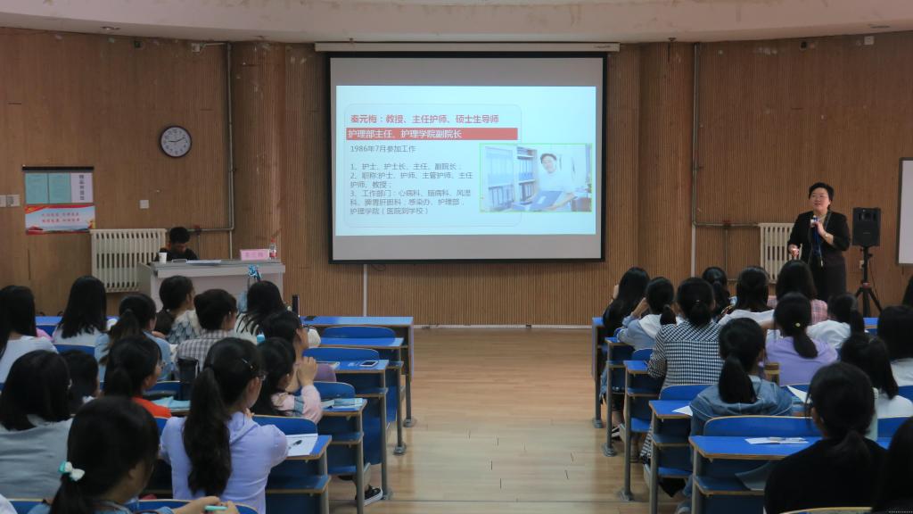 讲座中,秦元梅从护理职业生涯方面展开讲述,以个人简历入手,生动的讲述大学生该如何规划职业生涯,为刚入学的新生指引方向;杨主任从专业教育方面入手,对新生的专业学习提出了具体的要求和标准。