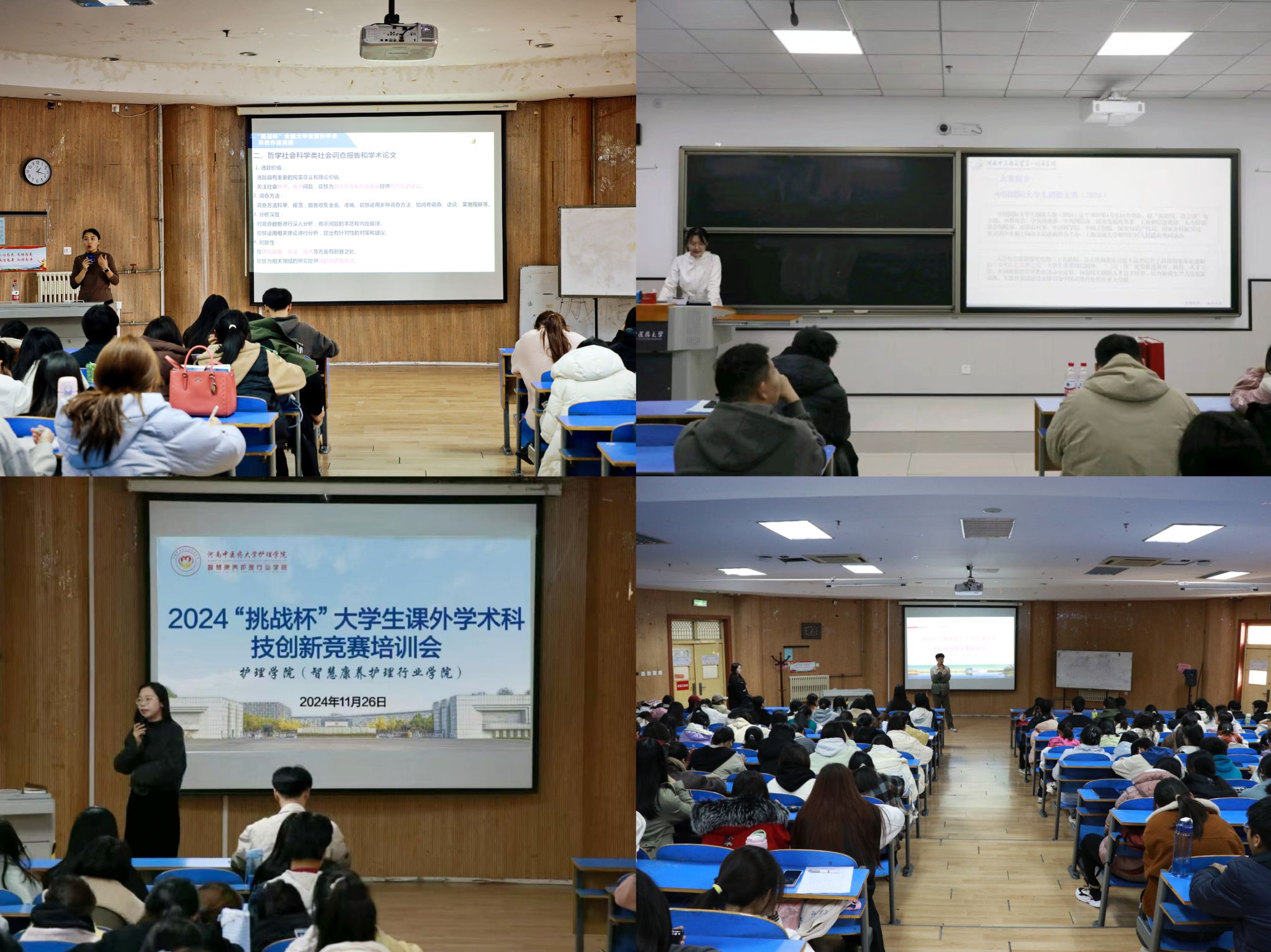 本网讯(文/王嘉煜 图/万象城awcsport官网学生会)为进一步激发万象城学生的学术热情和创新潜能,帮助其深入了解“挑战杯”大学生课外学术科技作品竞赛规则,掌握科学有效的备赛方法和比赛策略,万象城awcsport官网(智慧康养护理行业学院)于2024年11月至12月期间,成功举办了“挑战杯”大学生课外学术科技作品竞赛系列培训会。本次系列培训会共三期,共500余名学生参与。