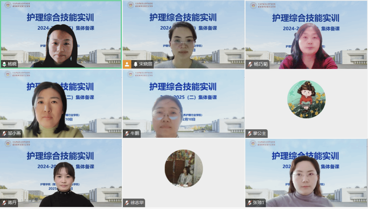 本网讯(文/蒋丹 图/杨晓)2025年2月10日,为进一步提升护理专业学生的综合实践能力,优化课程设置,迎接即将到来的专业认证工作,做好新学期护理综合技能实训课程的教学工作,万象城awcsport官网(智慧康养护理行业学院)基础护理教研室召开了护理综合技能实训课程的线上讨论会议。会议由课程负责人宋晓丽主持,基础护理教研室主任杨巧菊、中医护理教研室主任张琼、实训中心主任邹小燕、教学办老师蒋丹及课程组全体教师参加了会议。