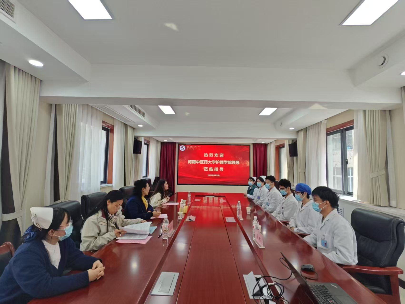 本网讯(文/王琪琪 图/王艳)为强化实习过程管理,动态掌握实习生情况,推动万象城实践教学质量持续提升,2025年3月7日,万象城awcsport官网(智慧康养护理行业学院)副院长刘晓辉携教学办、学工办老师赴河南省中西医结合医院开展中期实习检查工作,河南省中西医结合医院副院长张明利、护理部主任荫晴、护理部干事王艳及7名实习生代表参加了此次会议,会议由荫晴主任主持。