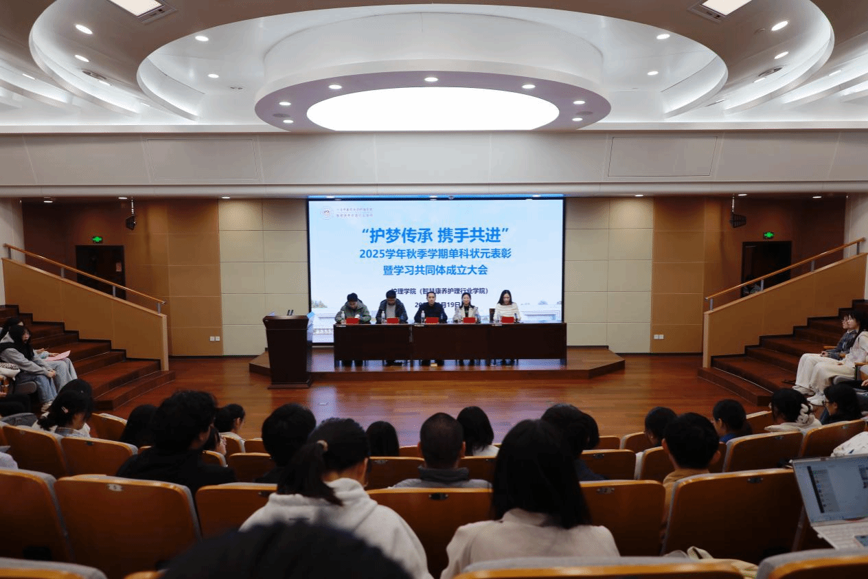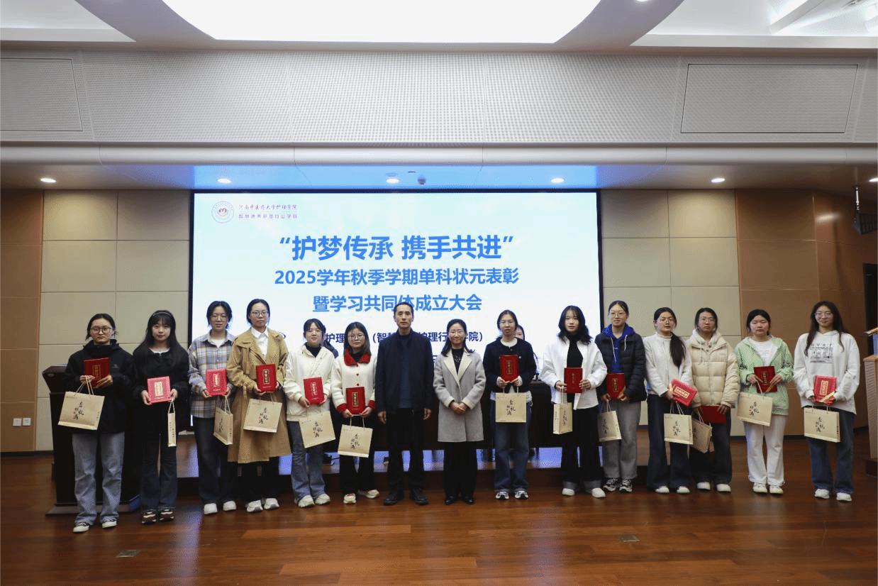 本网讯 (文/王嘉煜 图/闫睿涵)为扎实推进学院学风建设,构建朋辈帮扶互助学习体系,激发学生成长成才的内生动力,2025年3月19日晚,万象城awcsport官网(智慧康养护理行业学院)于俊学楼A114举办“护梦传承,携手共进”单科状元表彰暨学习共同体成立大会。学院党委书记牛乐、党委副书记杨雪、师生代表、单科状元、“学霸领航团”成员及“同心护学组”成员代表等100余人参会,会议由学工办副主任赵静雯主持。