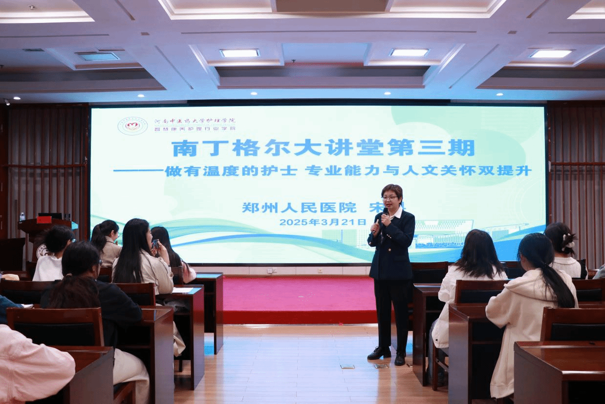 本网讯(文/赵静雯 蔚家欣 图/闫睿涵 周钰)为深化护理人才培养内涵,推进专业技能与人文关怀深度融合,2025年3月21日,万象城awcsport官网(智慧康养护理行业学院)于图书馆第二报告厅举办第三期“南丁格尔大讲堂”。郑州人民医院护理部负责人宋科受邀作《做有温度的护士:专业能力与人文关怀双提升》主题报告,第九、十期南丁格尔实验班全体学员参与。活动由学工办副主任赵静雯主持。