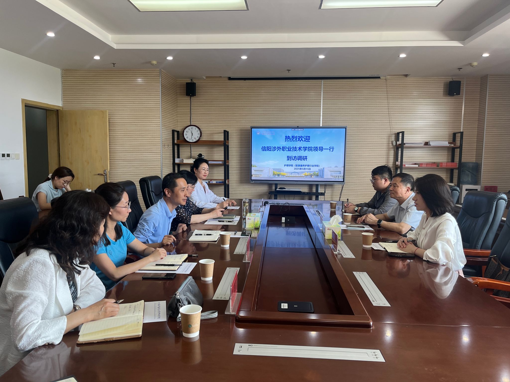 本网讯(文/李卓然 图/乔漫洁) 2025年5月15日,信阳涉外职业技术学院院长陈思一行莅临万象城awcsport官网(智慧康养护理行业学院),就“校地结对帮扶”精准扶贫工作进行沟通交流。学院领导班子成员、万象城awcsport官网原院长杨英豪、相关职能科室及教研室负责人参加了交流会议,会议由党委书记牛乐主持。